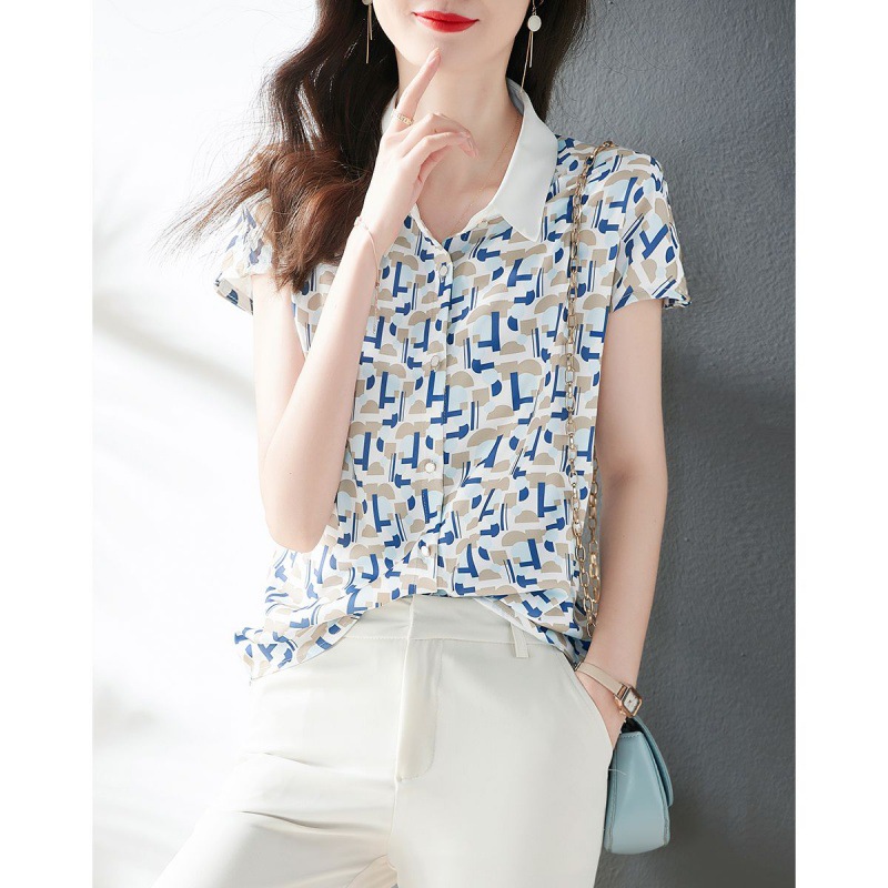 2023 여름 의류 새로운 간단한 모든 경기 기하학적 쉬폰 인쇄 소매 옷깃 패션 여성용 반소매 셔츠