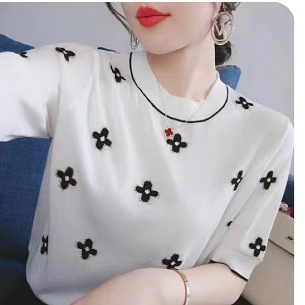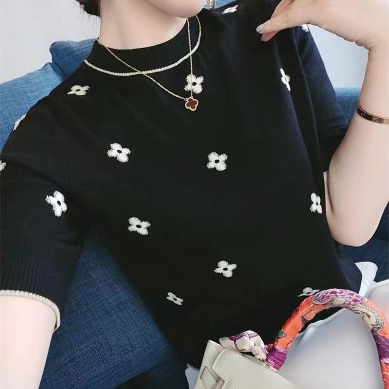 새로운 아이스 실크 탑 여성용 여름 대비 자카드 반팔 라운드 넥 스웨터 가벼운 럭셔리 트렌디 한 유럽 역 중공업 티셔츠스토어 가기