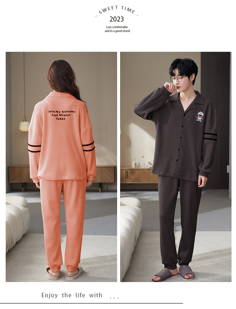 와플 니트 코튼 카디건 옷깃 파자마 여성 여름 의상 가을 느슨한 패션 커플 파자마