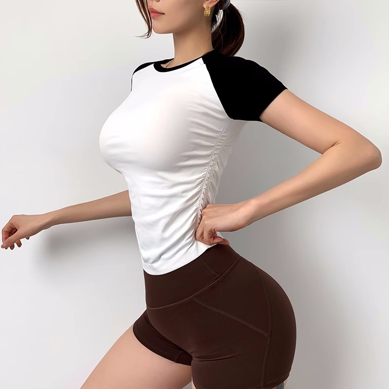 여름 꽉 라글란 슬리브 스포츠 탑 여성용 꽉 허리 요가 의류 피트니스 반소매 실행 캐주얼 속건 티셔츠