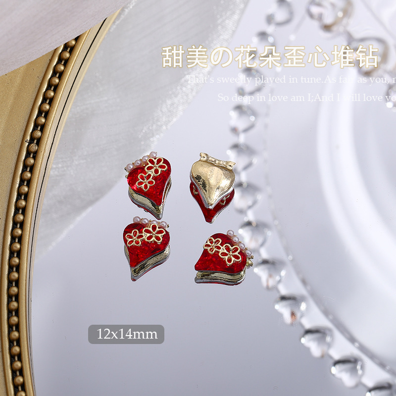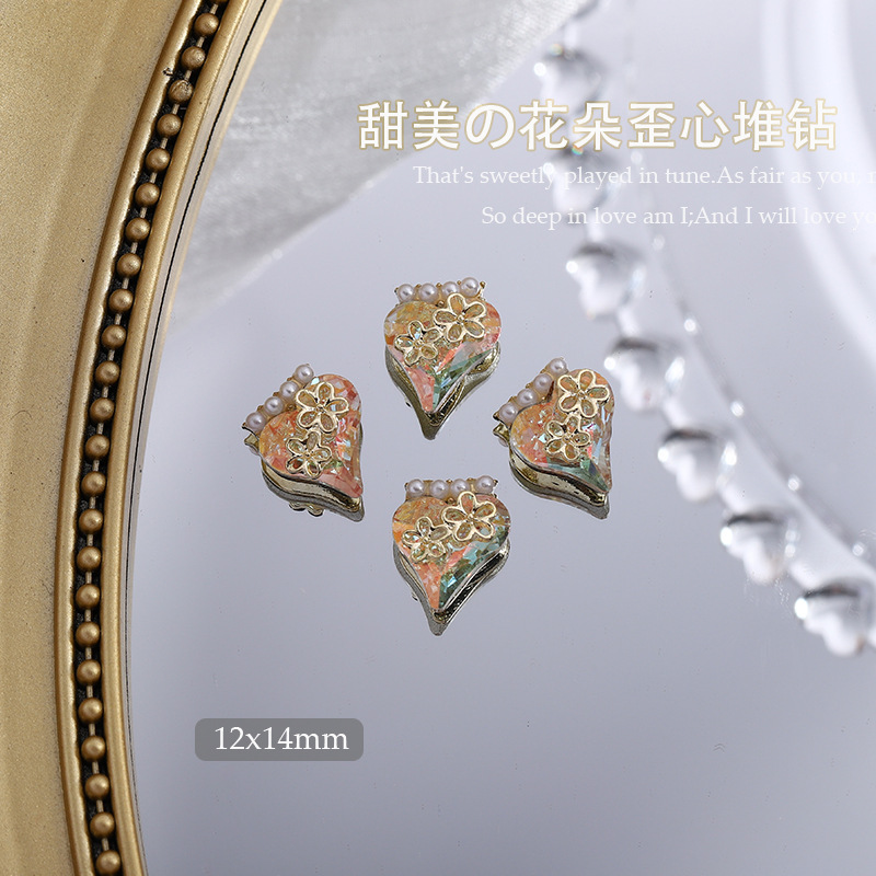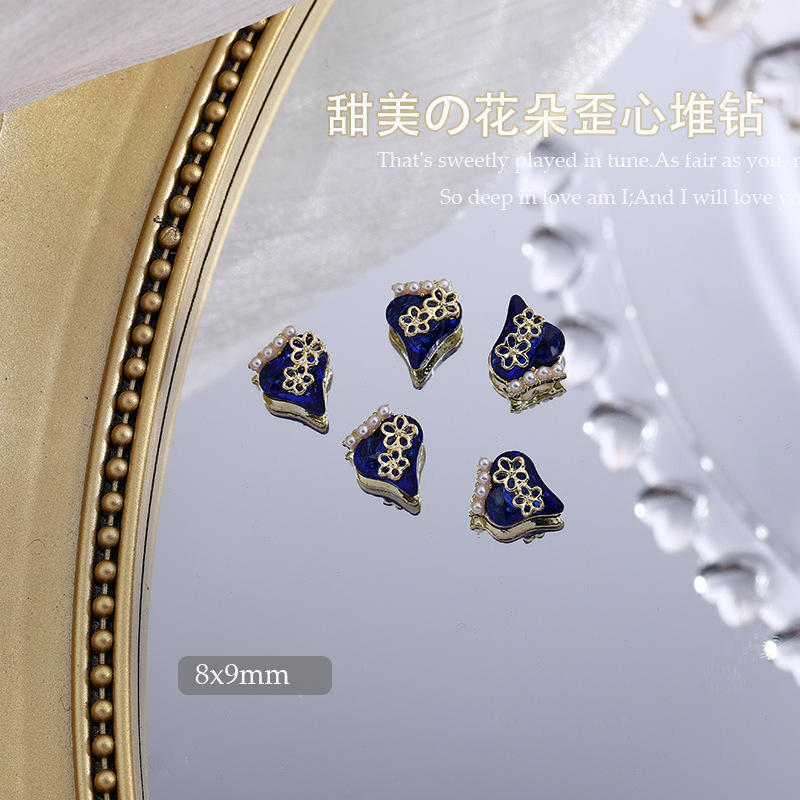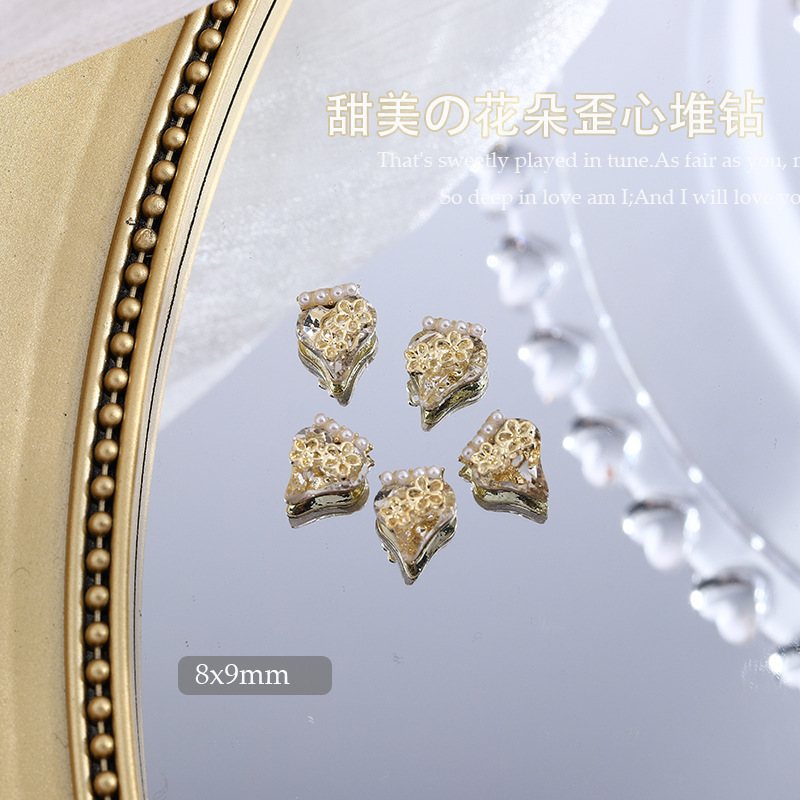 2023 새로운 플래시 금속 비뚤어진 심장 파일 드릴 네일 쥬얼리 도매 꽃 진주 입체 손 장식 드릴