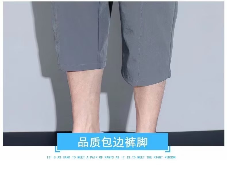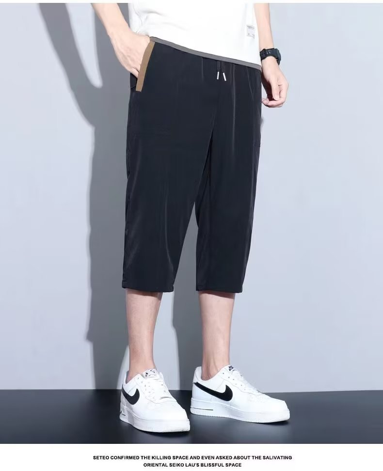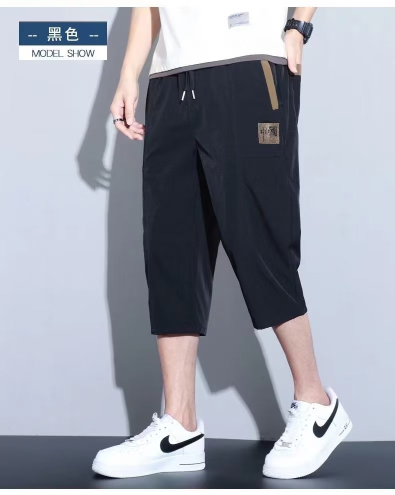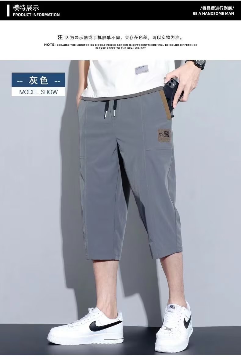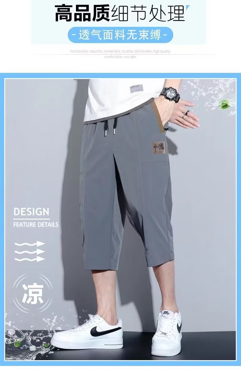 TikTok 크롭 캐주얼 바지 남성용 루즈핏 허리 반바지 트렌디 브랜드 자수 중국 아이스 실크 속건 스포츠 바지