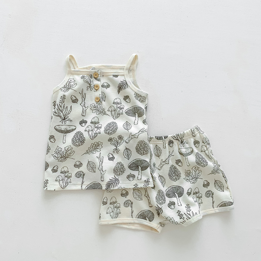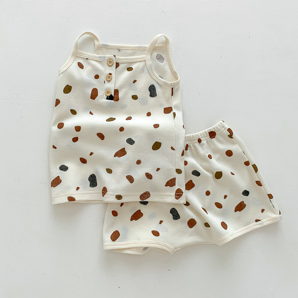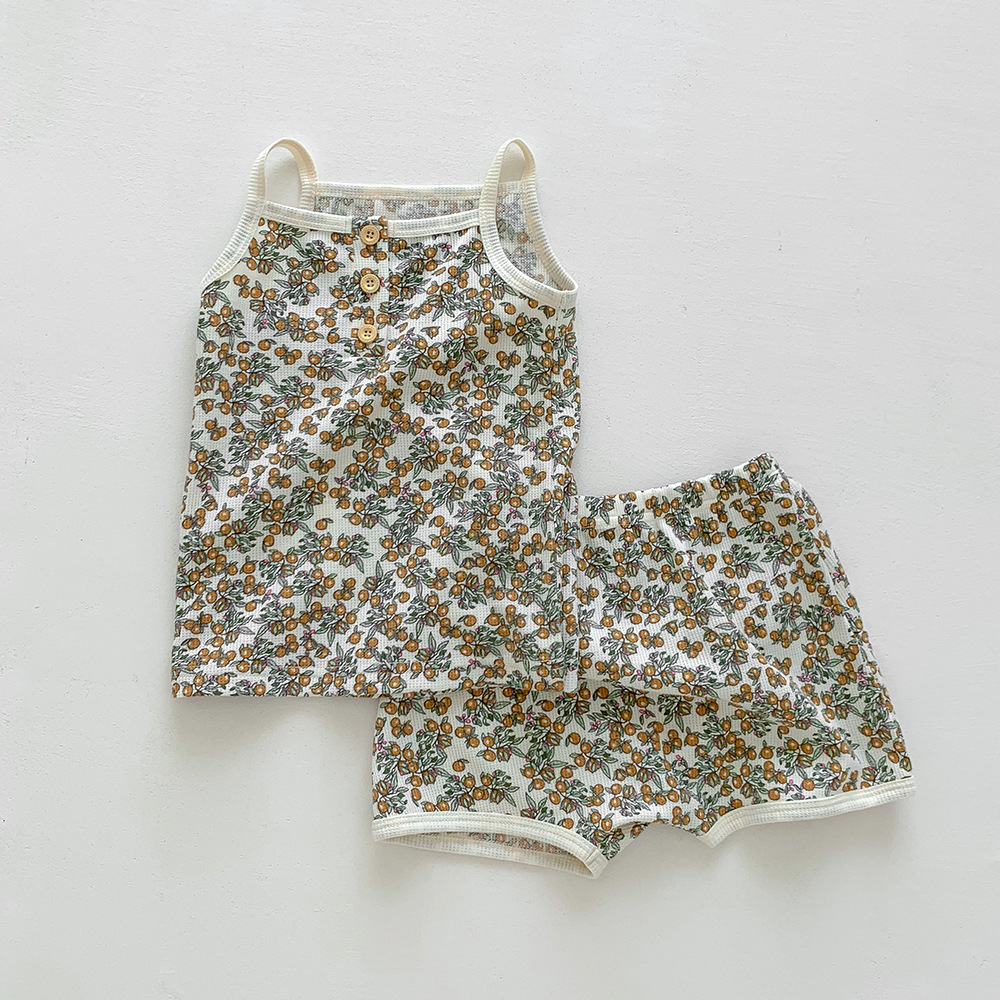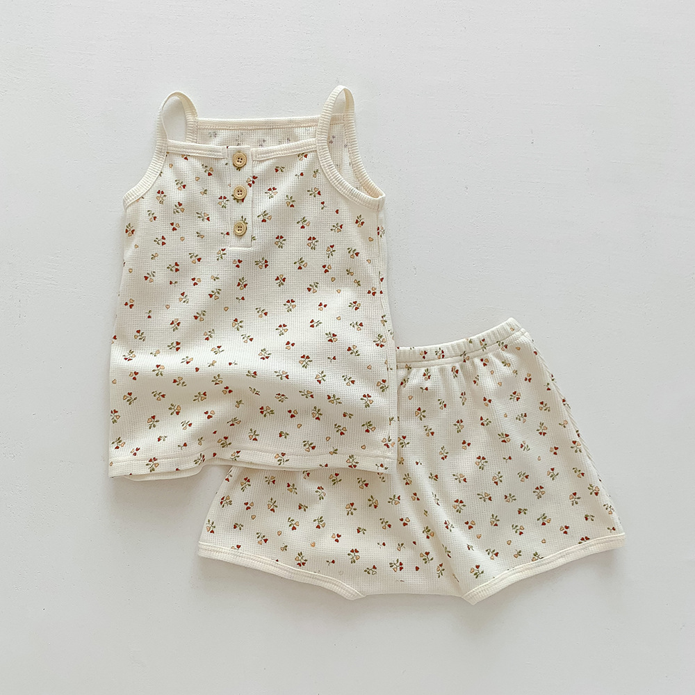 덴마크 스타일 어린이 가정 옷 여름 아기 슬링 세트 여아 조끼 북유럽 와플 아기 옷