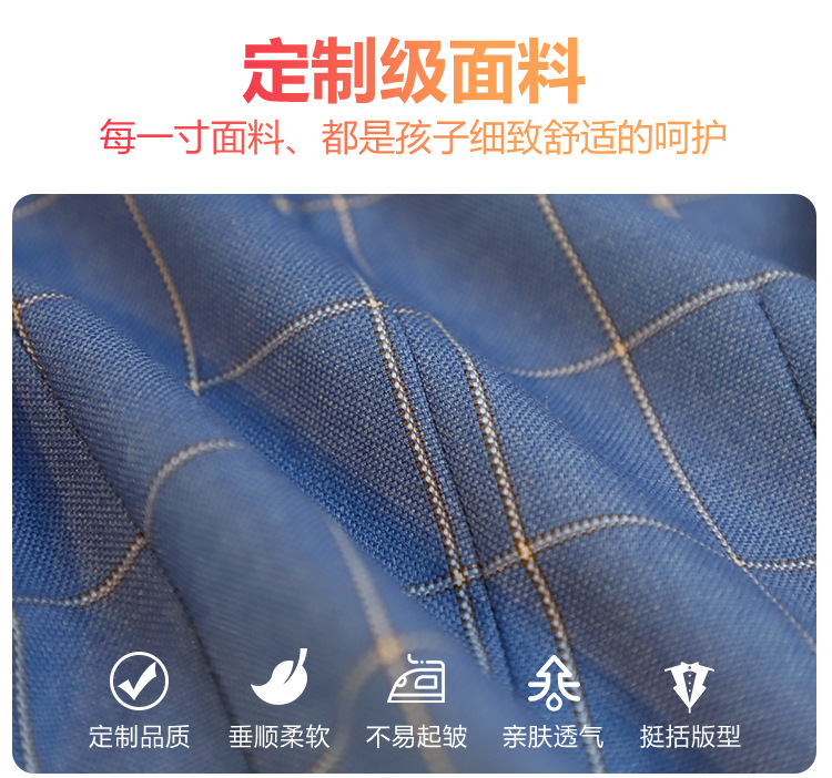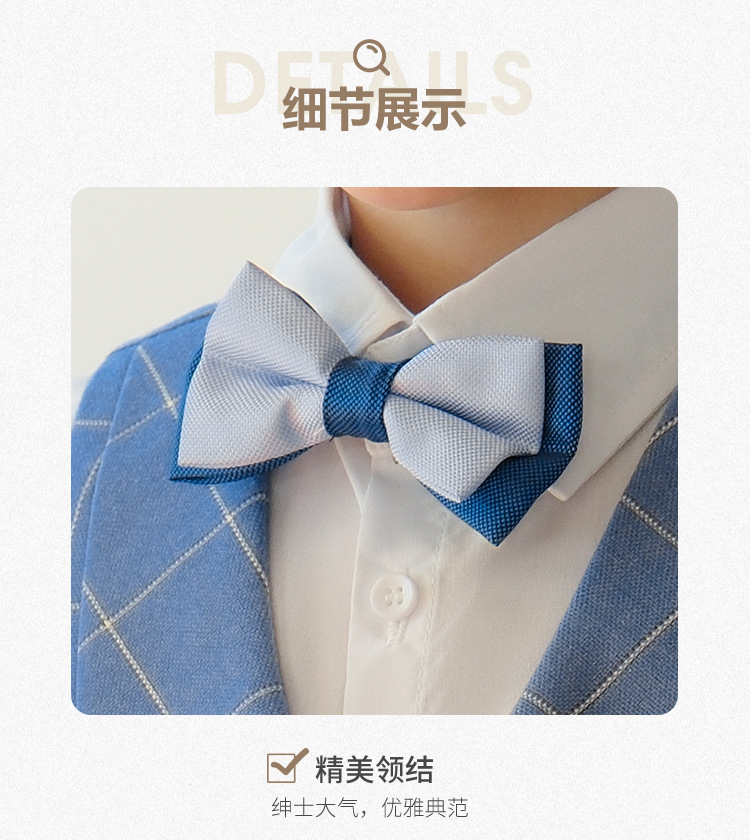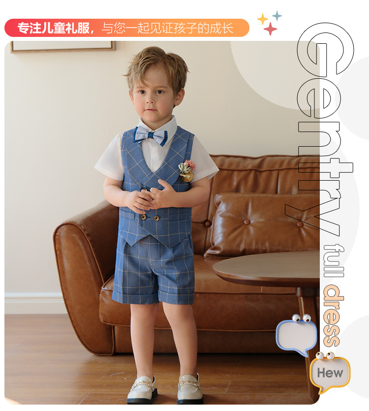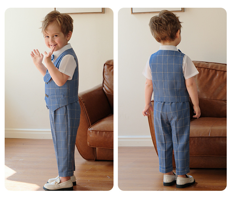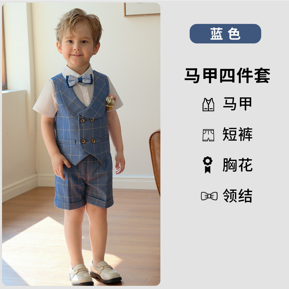 • 블루 그리드 반바지 4 종 세트 (조끼 + 반바지 + 나비 넥타이 + 코사지)