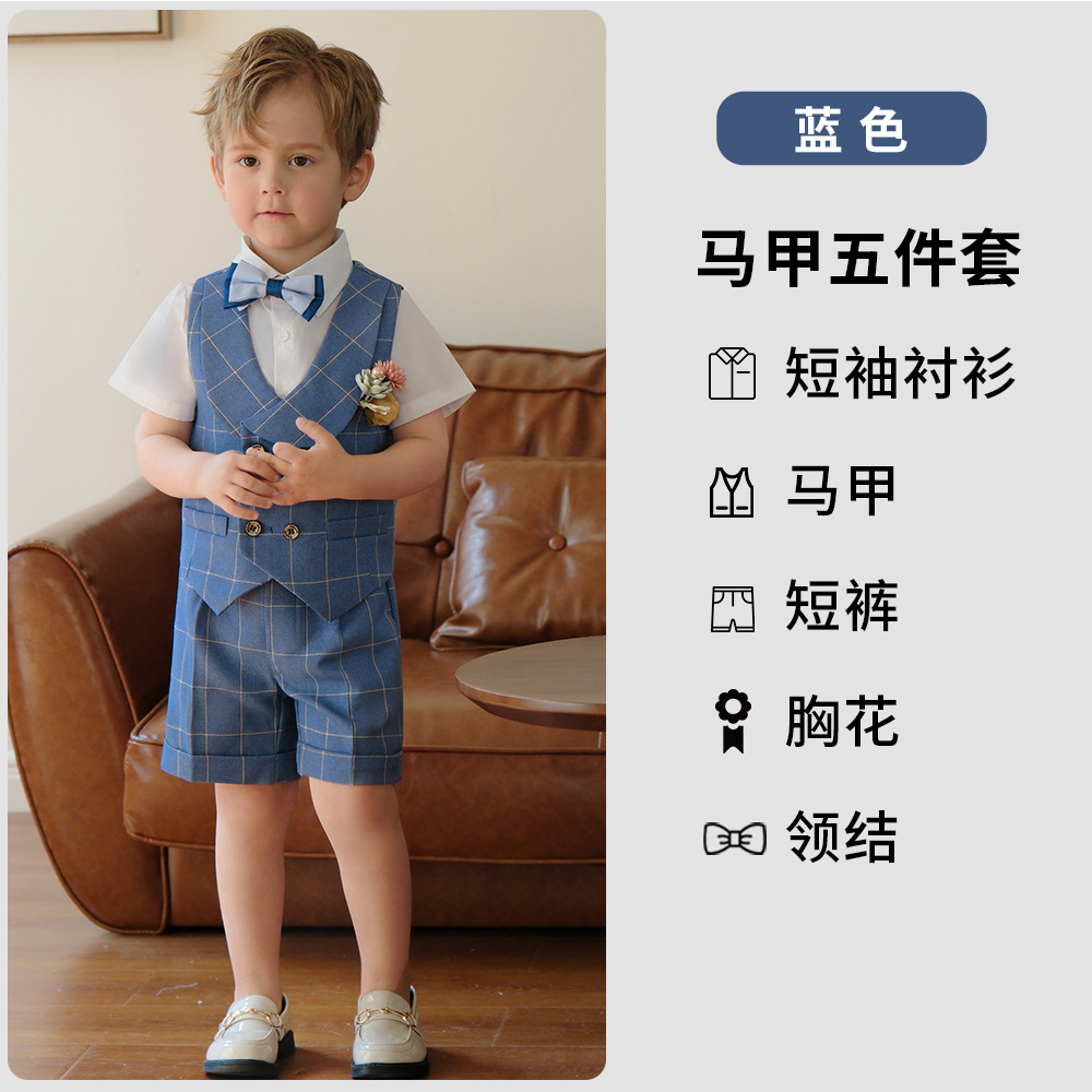 • 블루 반바지 5 종 세트 (조끼 + 반바지 + 반팔 셔츠 + 나비 넥타이 + 코사지)