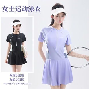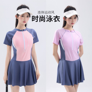 新款涤亚泳衣女时尚运动风保守加大码少女游泳温泉连体裙式游泳衣