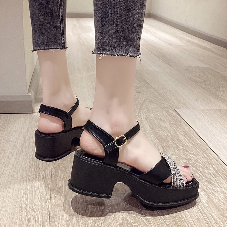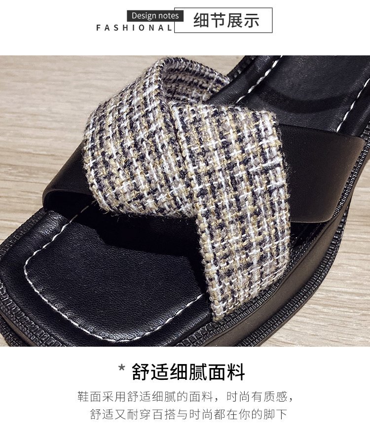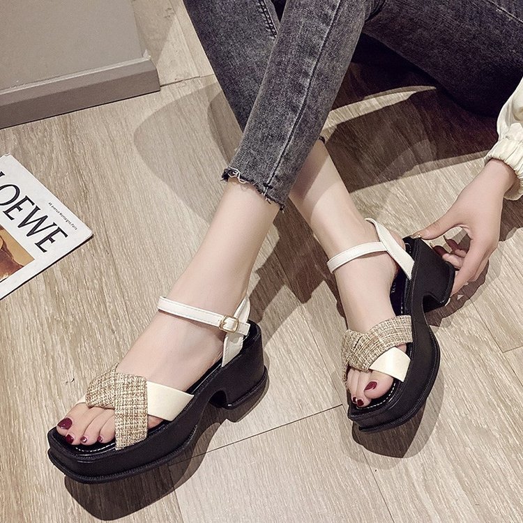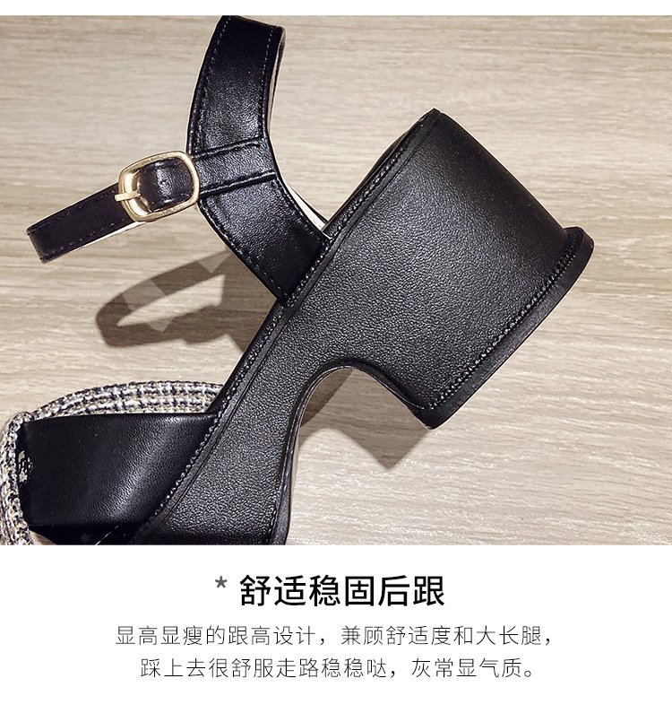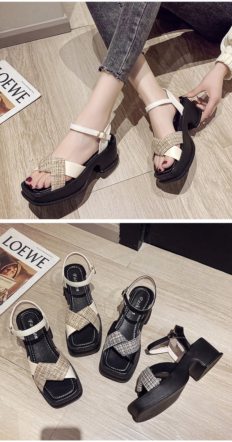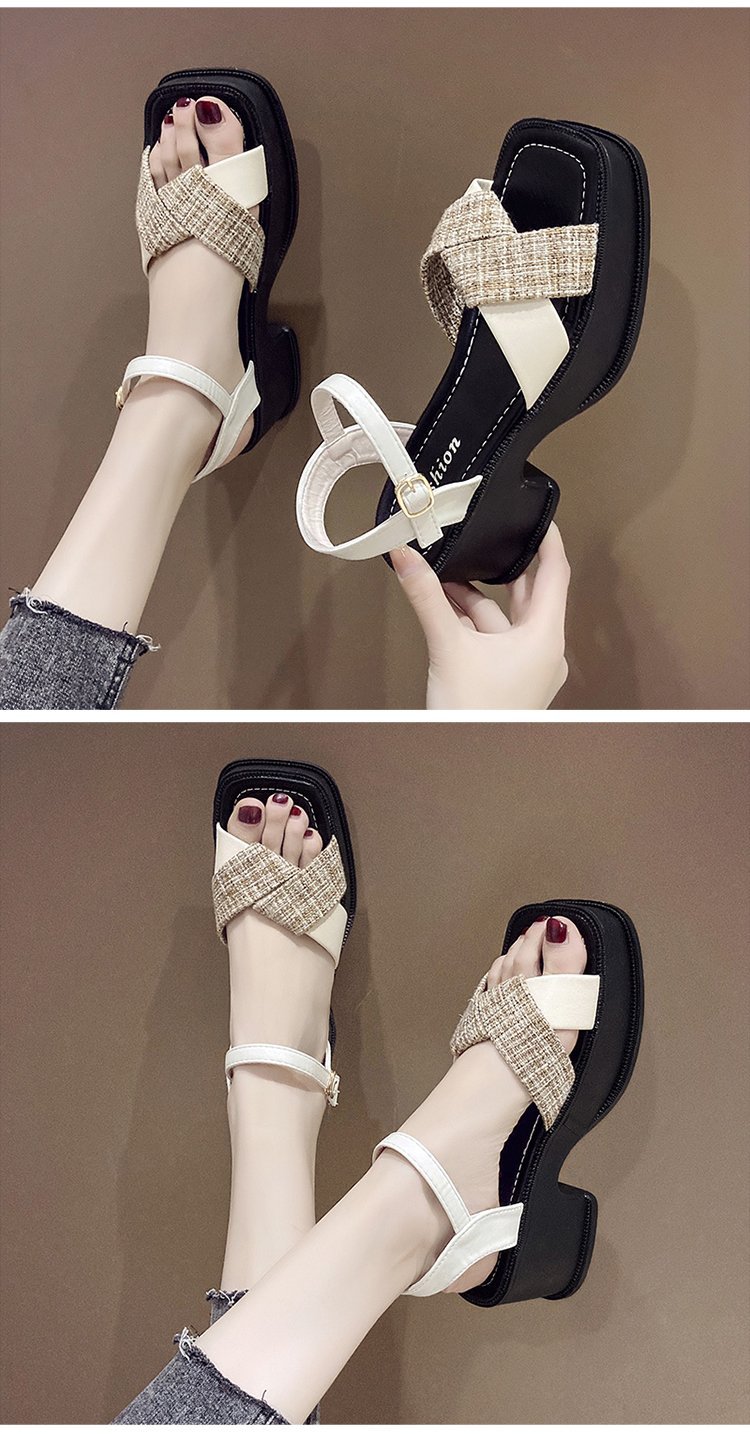 여성용 샌들 2023 여름 여성용 두꺼운 하이힐 스퀘어 토 버클 샌들과 새로운 한국 스타일 격자 무늬 컬러 크로스 오버스토어 가기