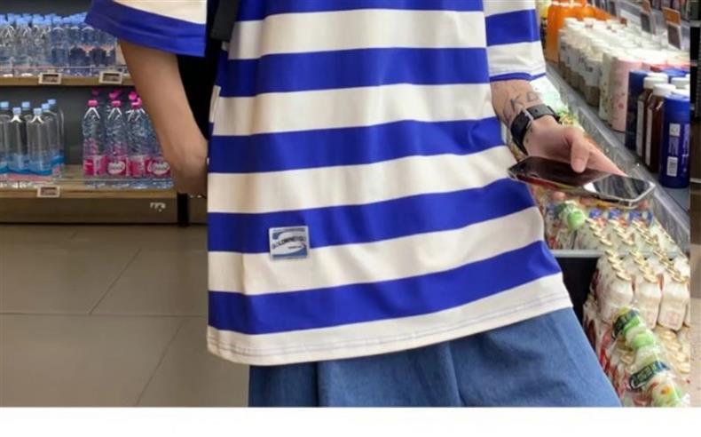 남성용 스트라이프 반팔 티셔츠 2023 New in 홍콩 스타일 여름 루즈한 티셔츠 학생 커플 반팔스토어 가기
