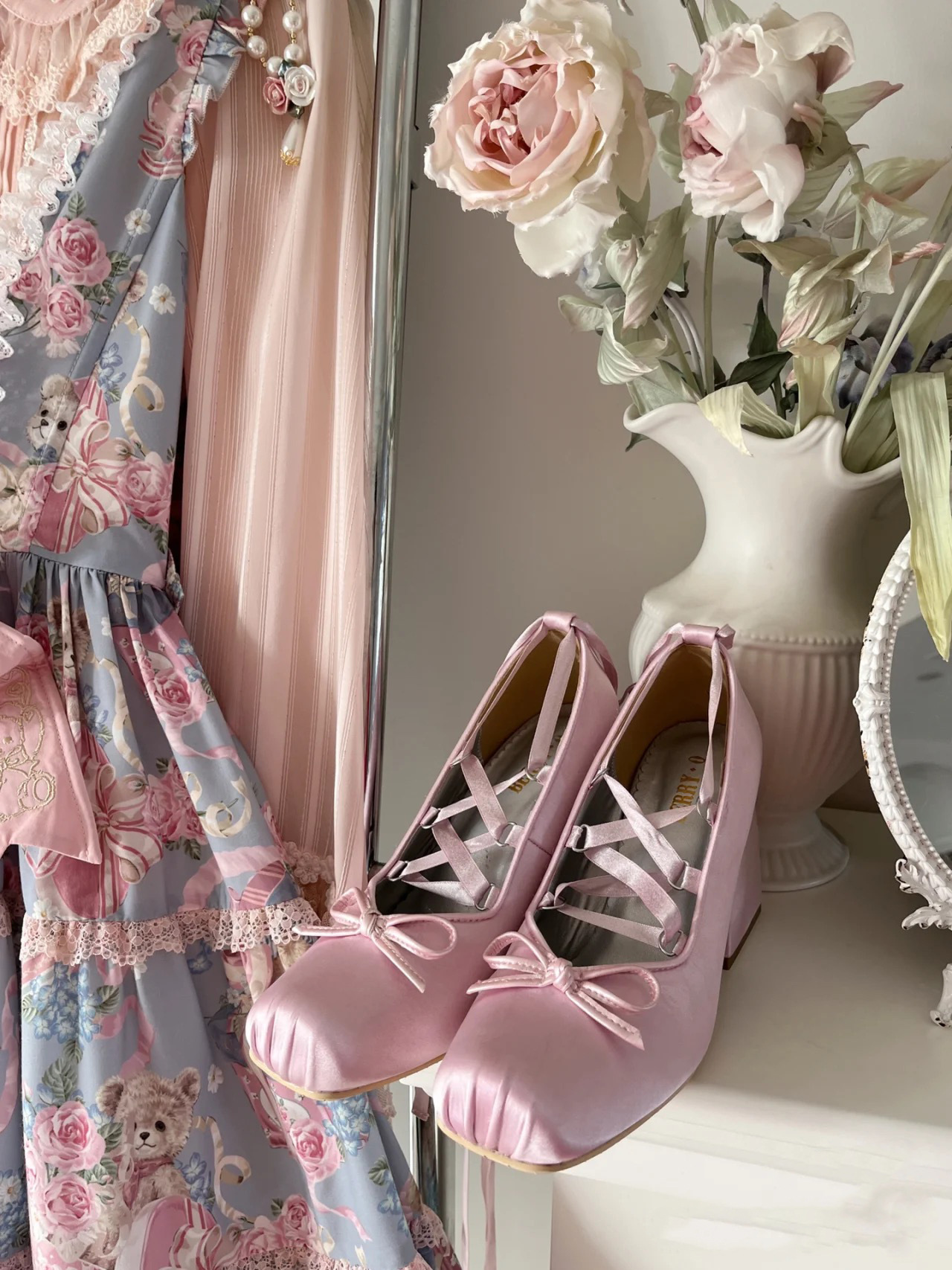 핑크 크로스 스트랩 하이힐 청키 힐 여아 발레 슈즈 아웃웨어 프랑스 우아한 새틴 로리타 펌프스