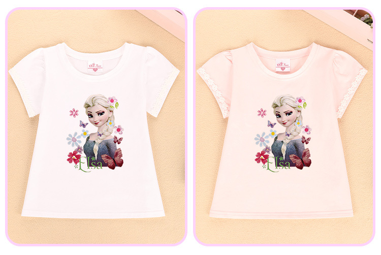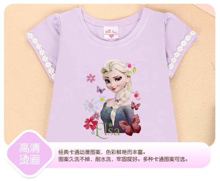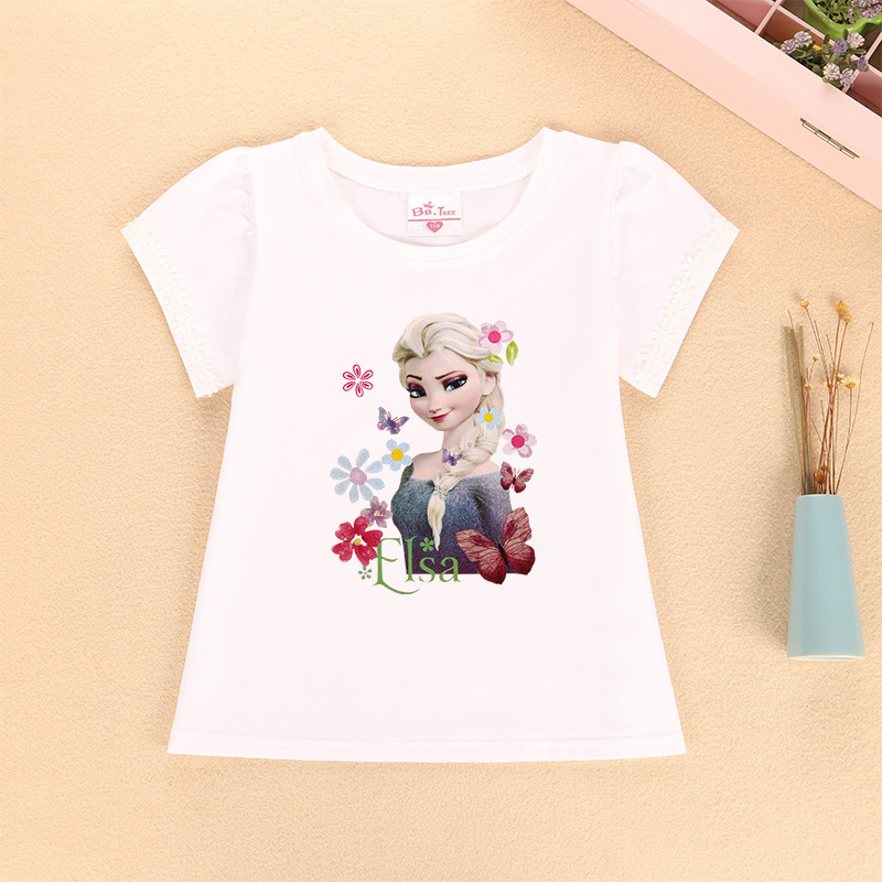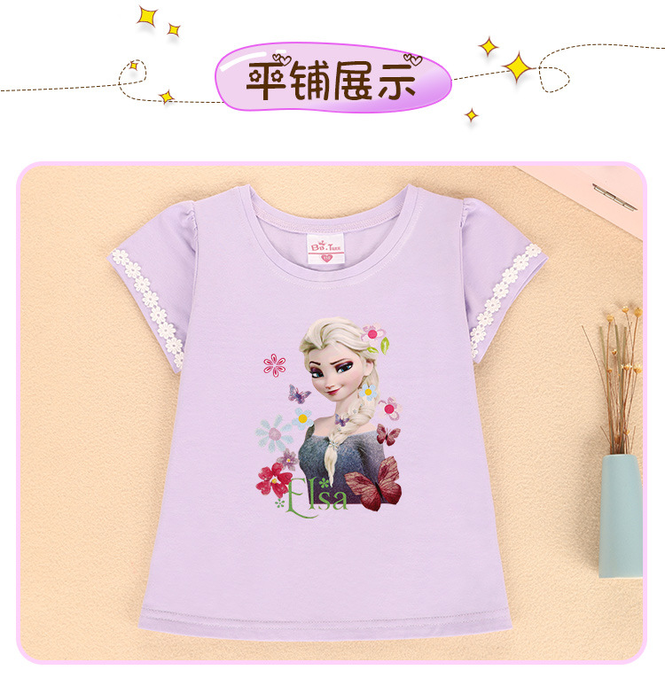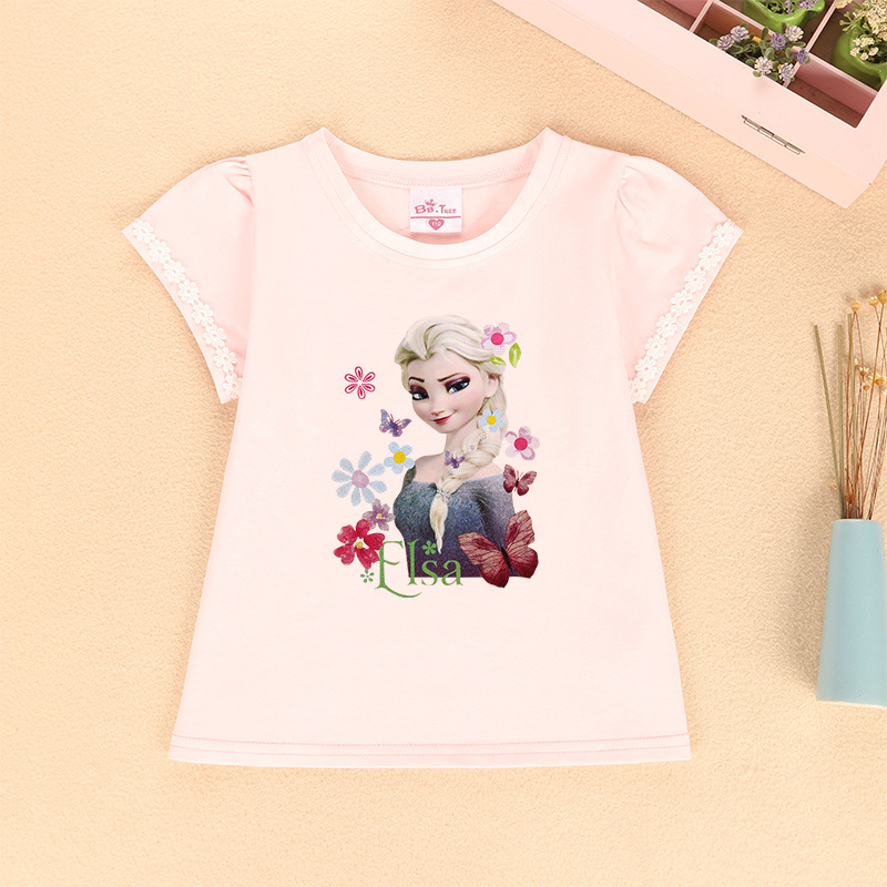 새로운 어린이 반팔 티셔츠 여름 서양식 레이스 슬리브 짧은 T-카드 인쇄 패턴 여아 라운드 넥 짧은 소매