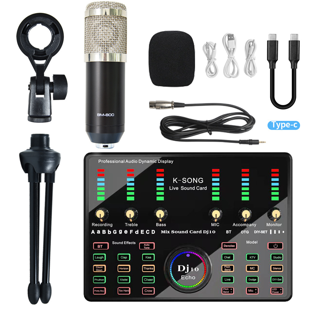 • 블랙 실버 BM800 + Dj10 사운드 카드 + 삼각대 마이크 브래킷 + Type-C 라인 표준 도매