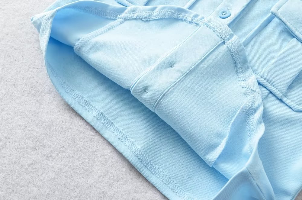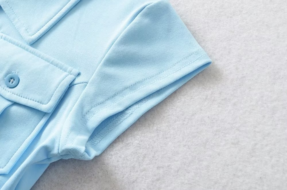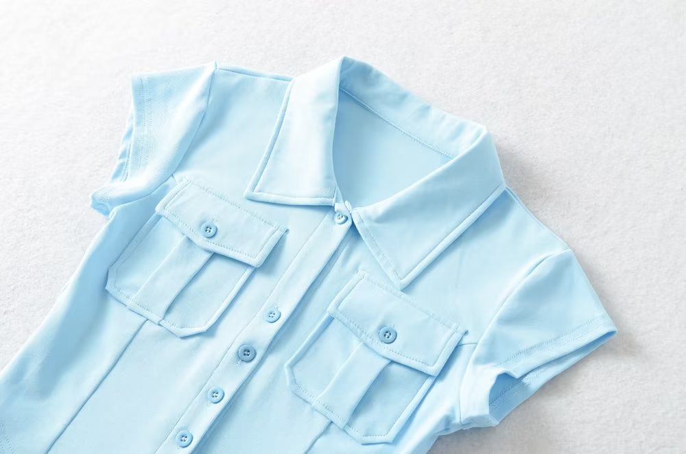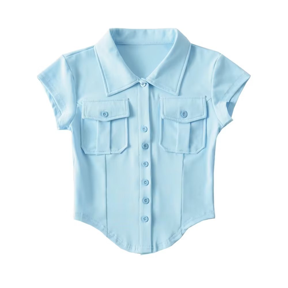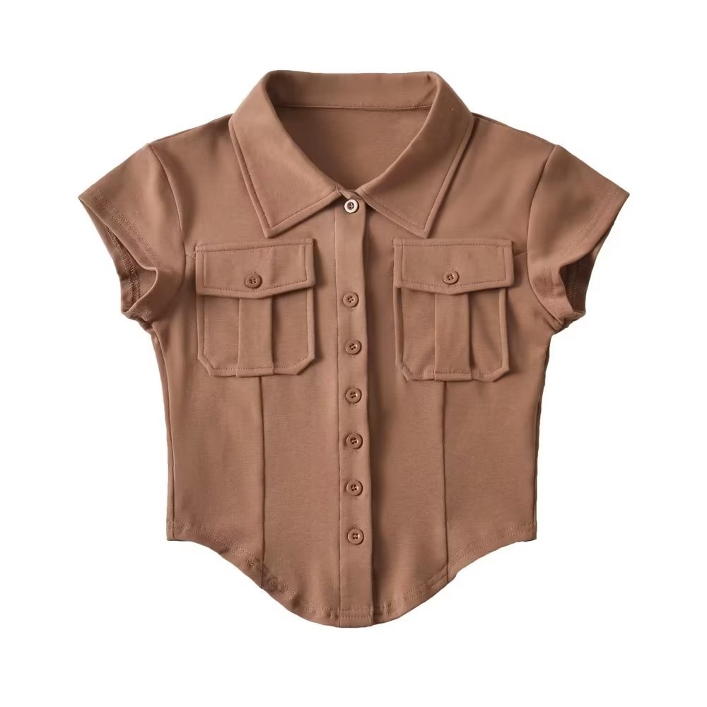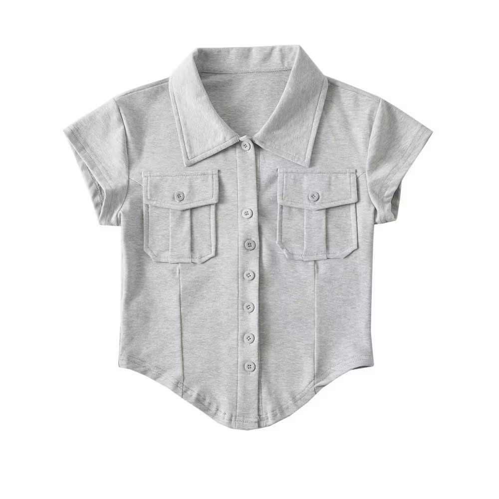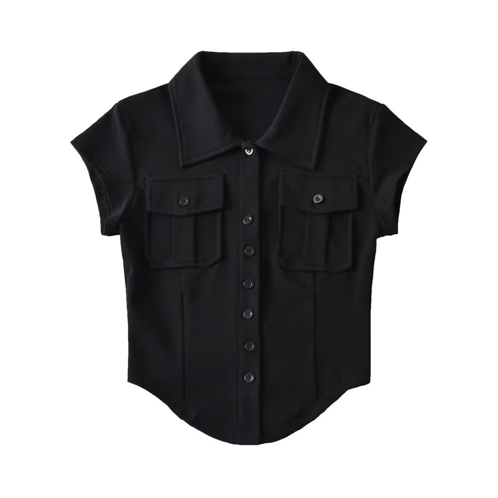 폴로 칼라 더블 포켓 반팔 티셔츠 2023 여름 새로운 스타일 순수한 욕망 브레스트 슬림핏 짧은 라운드 밑단 탑스토어 가기