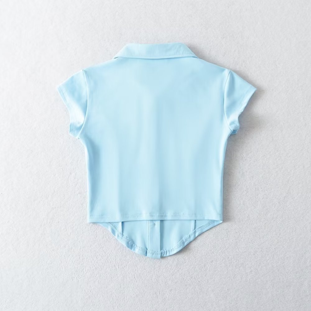 폴로 칼라 더블 포켓 반팔 티셔츠 2023 여름 새로운 스타일 순수한 욕망 브레스트 슬림핏 짧은 라운드 밑단 탑