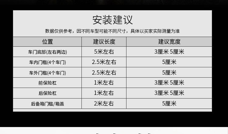 【使用范围】:汽车车身装饰,汽车门槛条防刮,迎宾踏板防护,后视镜防擦,后备箱护板防擦,汽车边角防擦等,随时DIY,多处可使用。