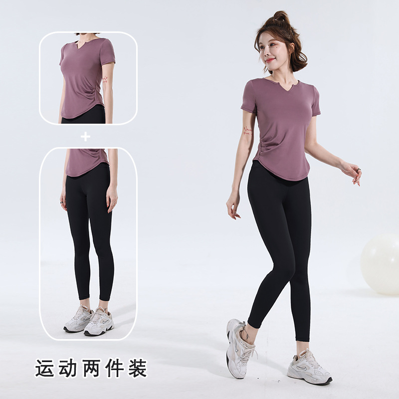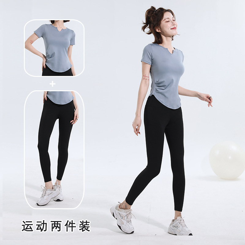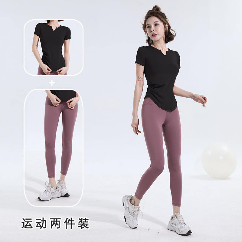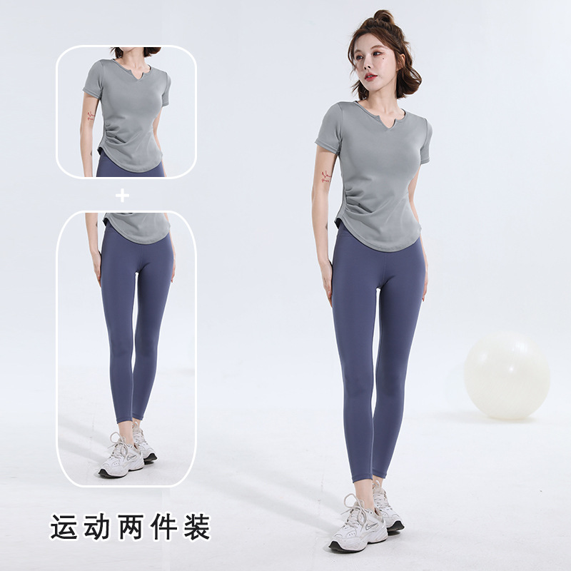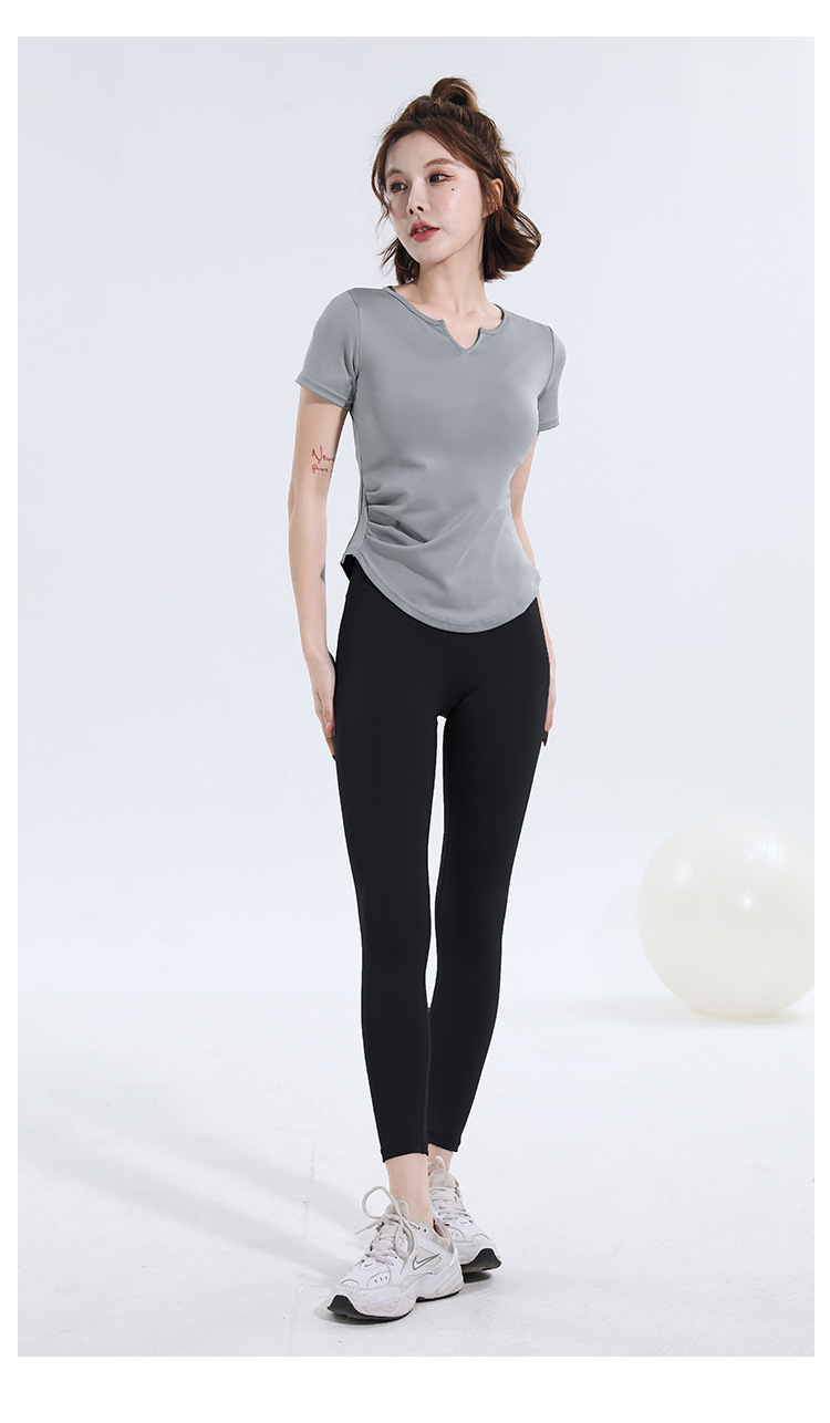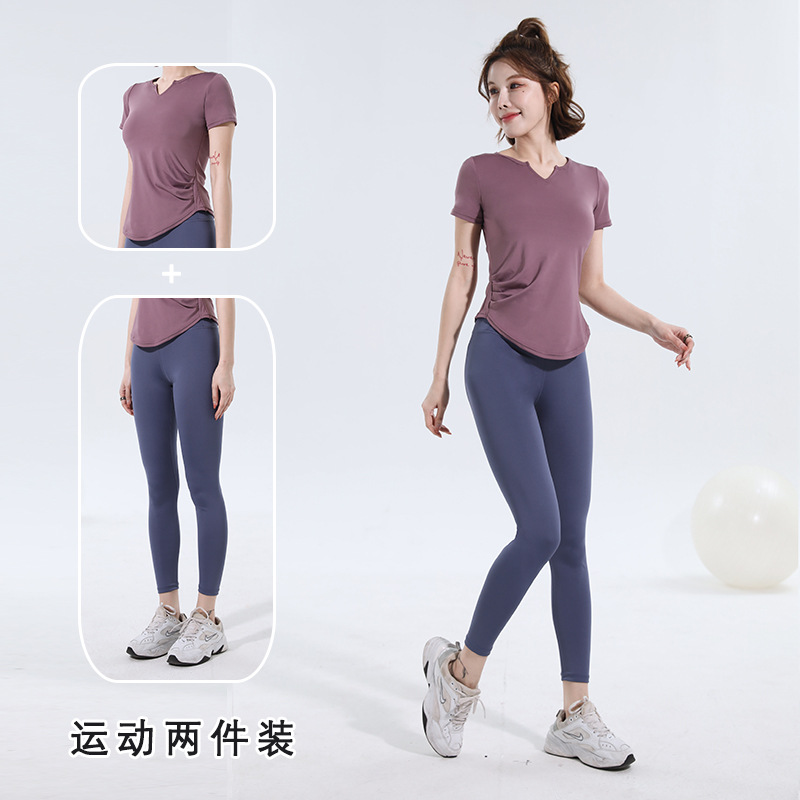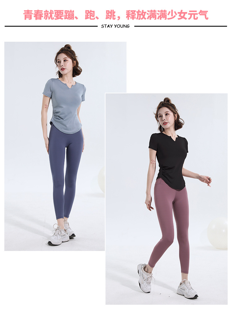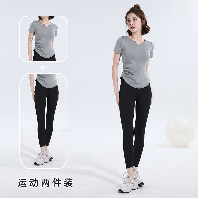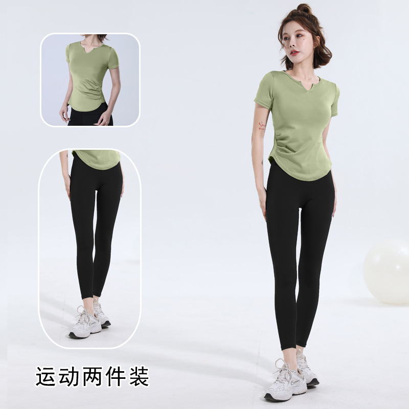 V-넥 반팔 티셔츠 속건 알몸 원활한 요가 세트 주름 허리 슬리밍 꽉 스포츠 피트니스 탑