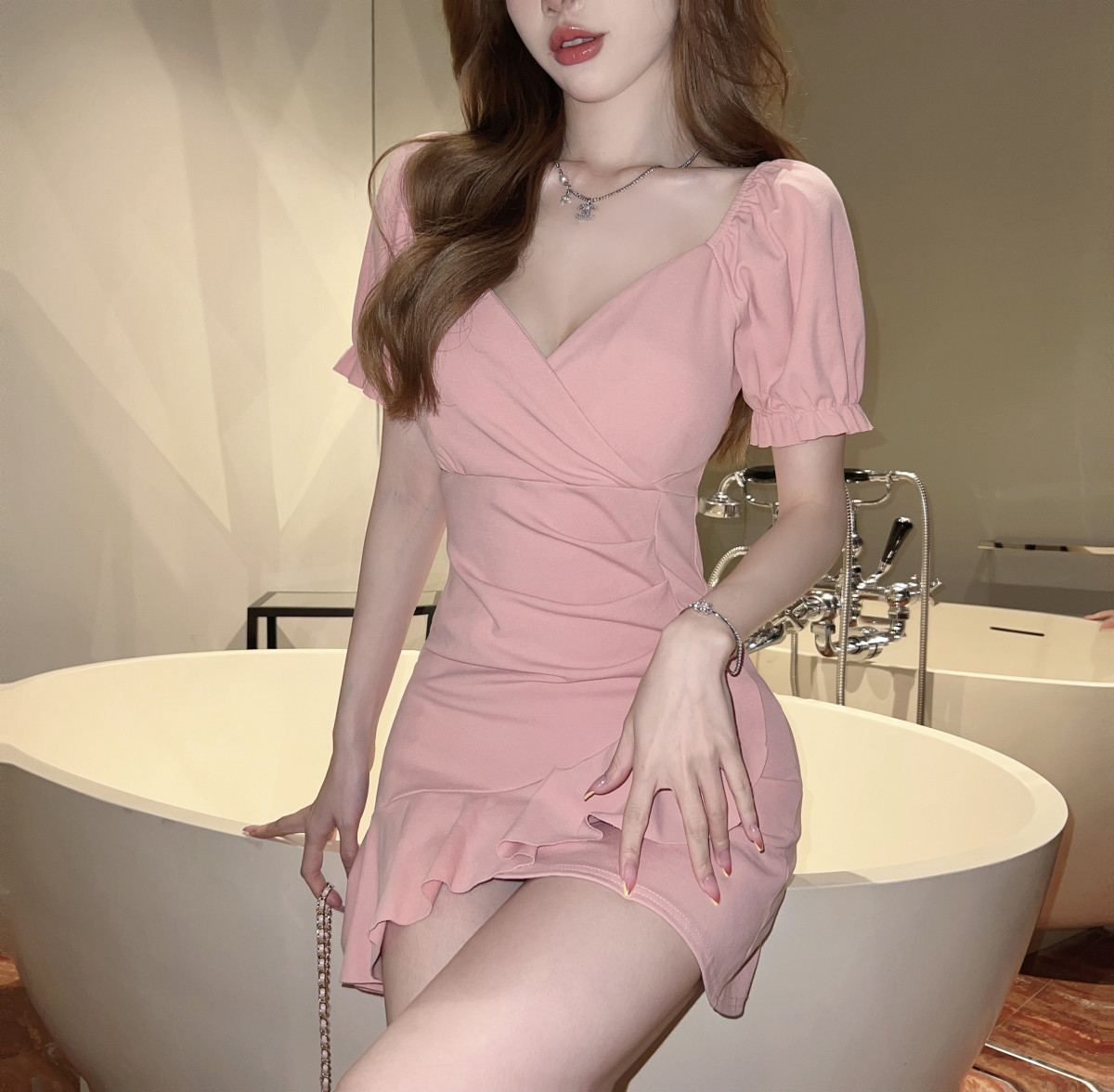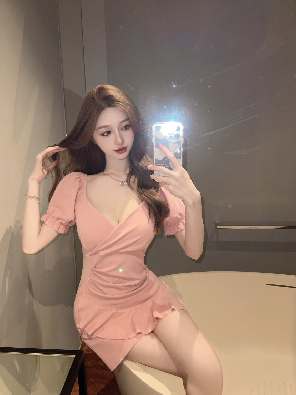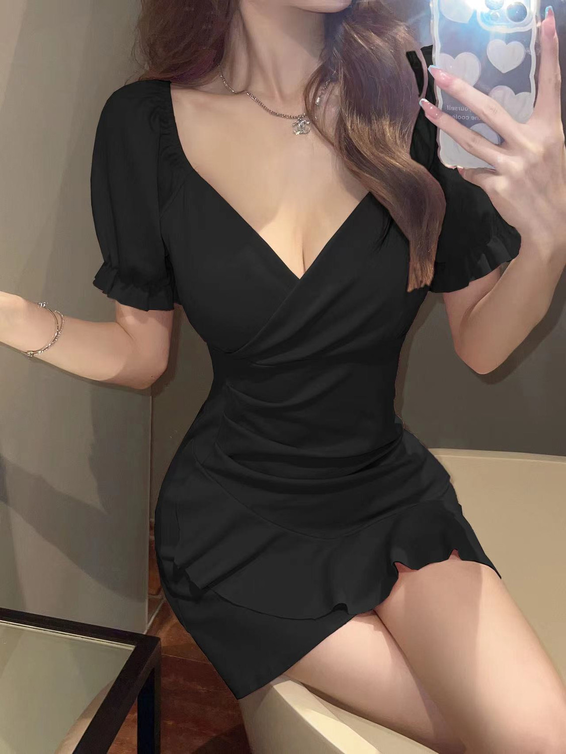 퍼프 슬리브 원피스 여성용 2023 섹시한 V-넥 로우 컷 우아한 주름 배꼽 커버 슬리밍 힙 스커트