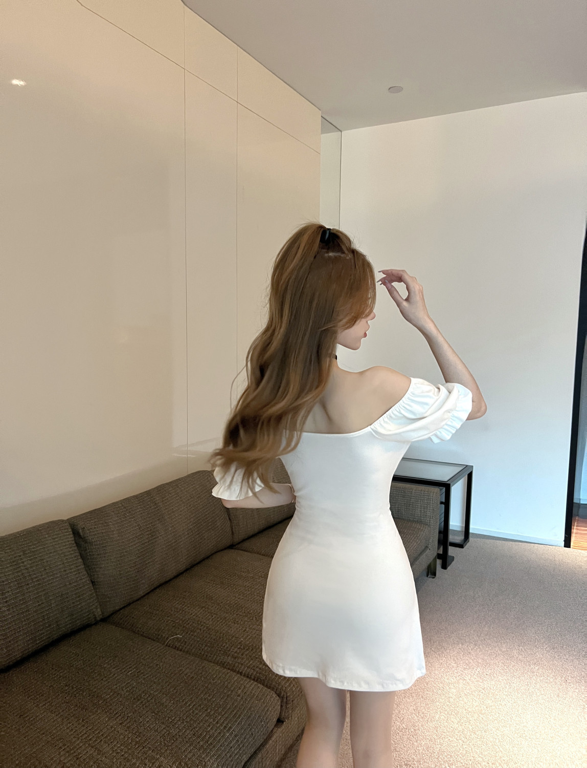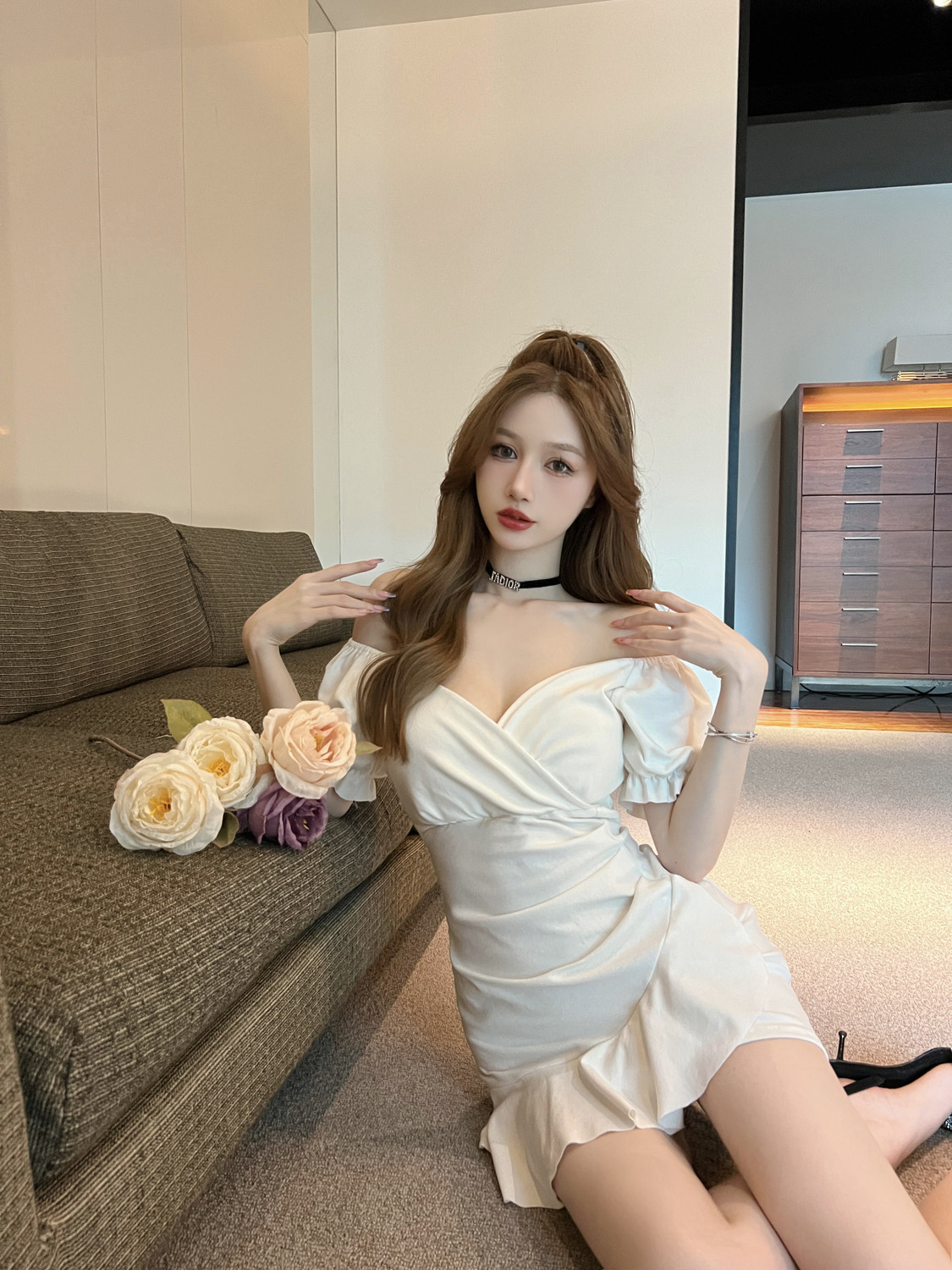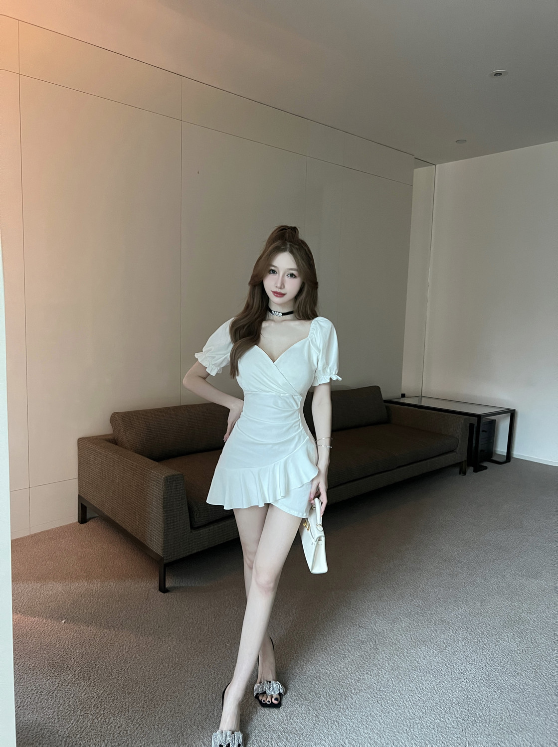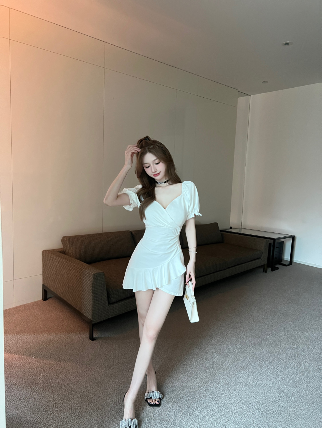 퍼프 슬리브 원피스 여성용 2023 섹시한 V-넥 로우 컷 우아한 주름 배꼽 커버 슬리밍 힙 스커트
