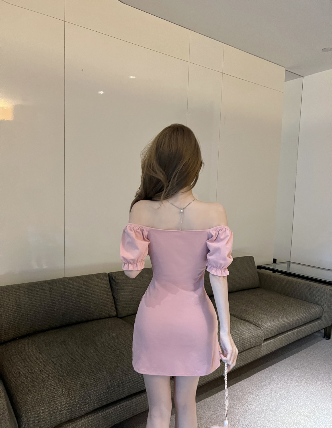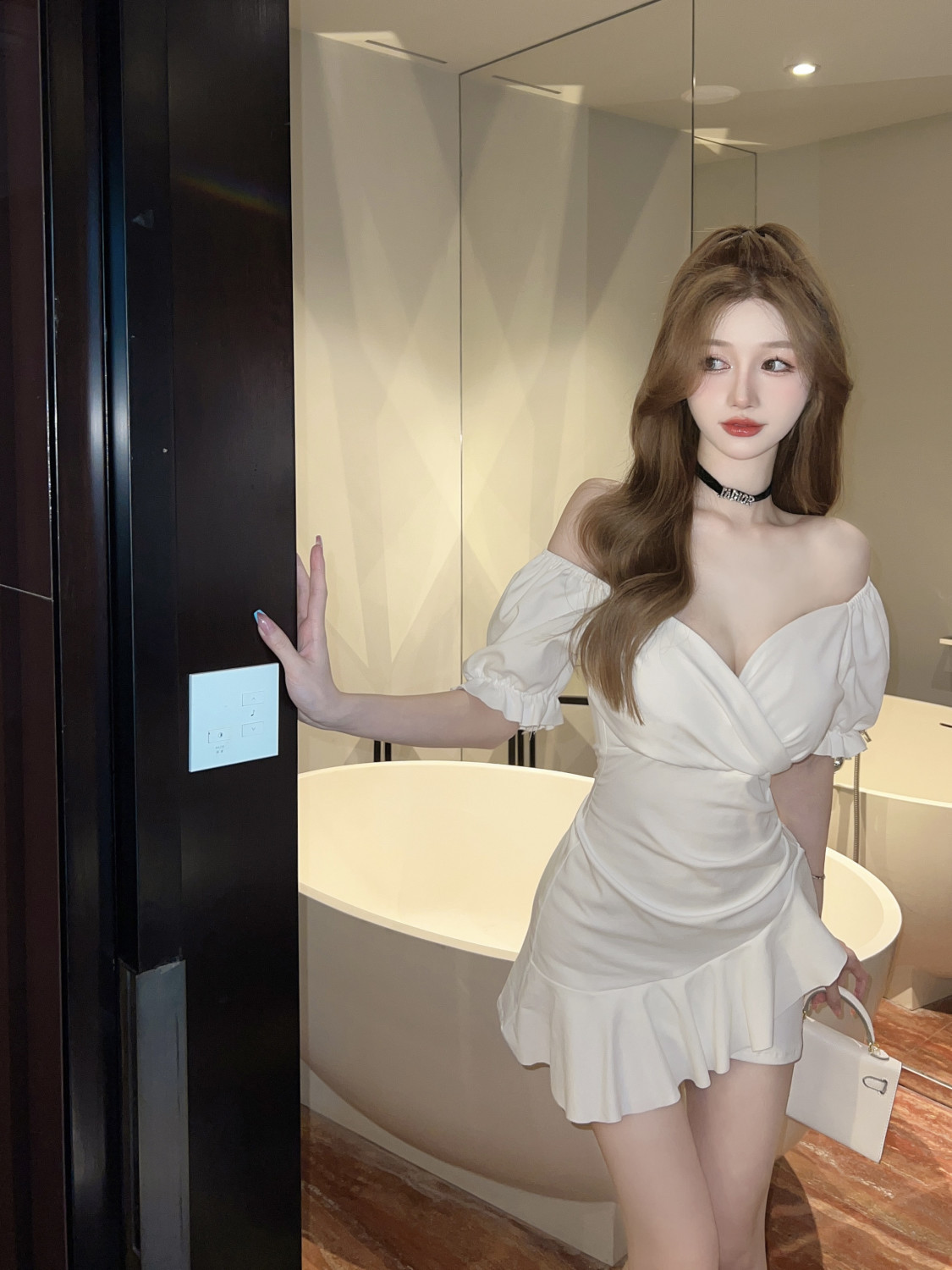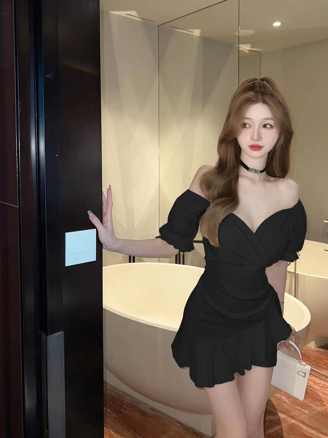 퍼프 슬리브 원피스 여성용 2023 섹시한 V-넥 로우 컷 우아한 주름 배꼽 커버 슬리밍 힙 스커트스토어 가기
