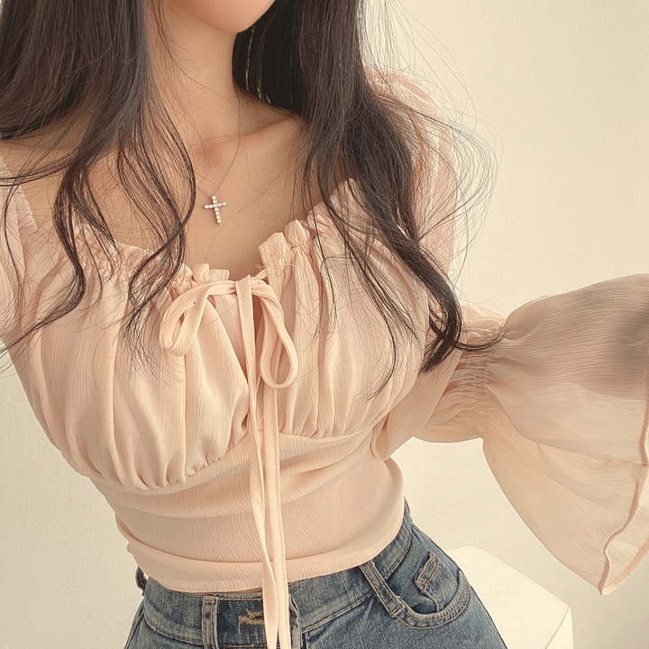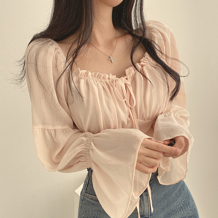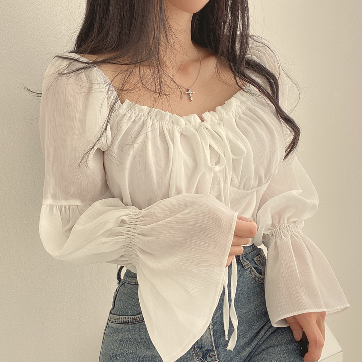 한국 스타일 세련된 여름 원피스 프랑스어 틈새 귀 가장자리 타이 업 스퀘어 칼라 허리 나팔 소매 쉬폰 셔츠 짧은 셔츠 여성용스토어 가기