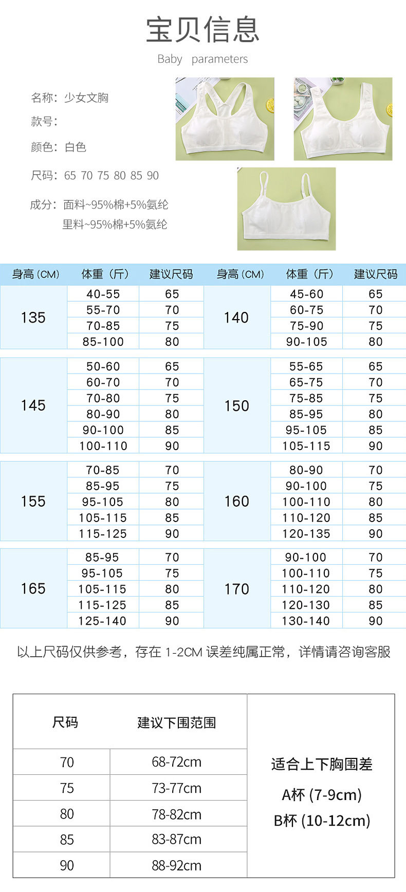여아 속옷 중간 어린이 발달 조끼 브래지어 순면 학생 슬링 강철 반지가없는 순수한 흰색 여아 브래지어