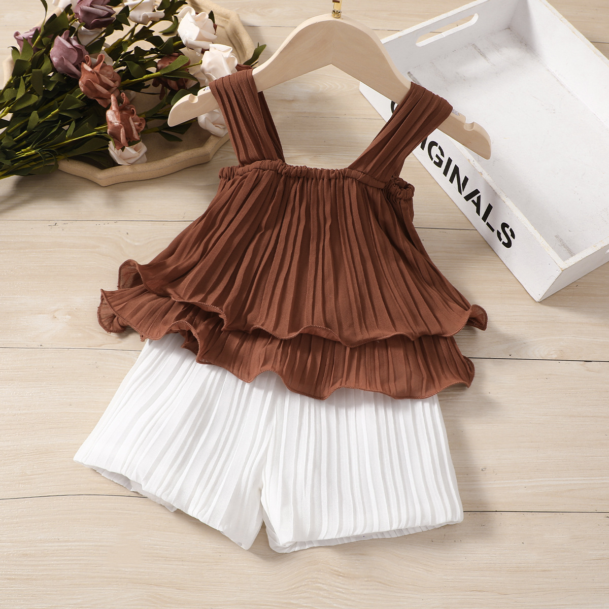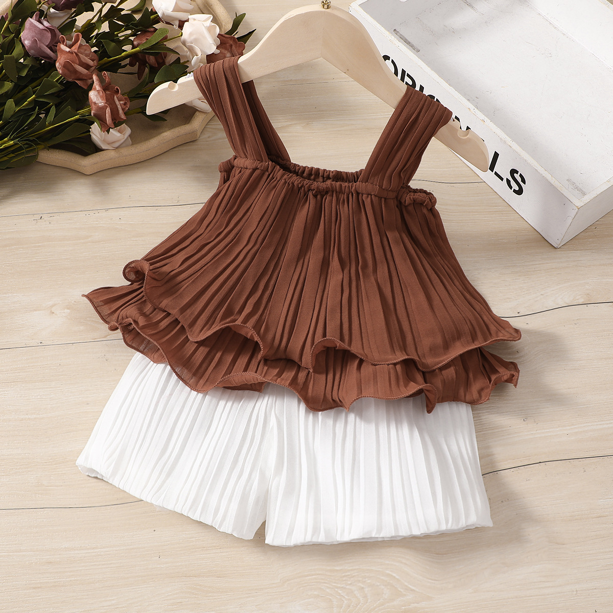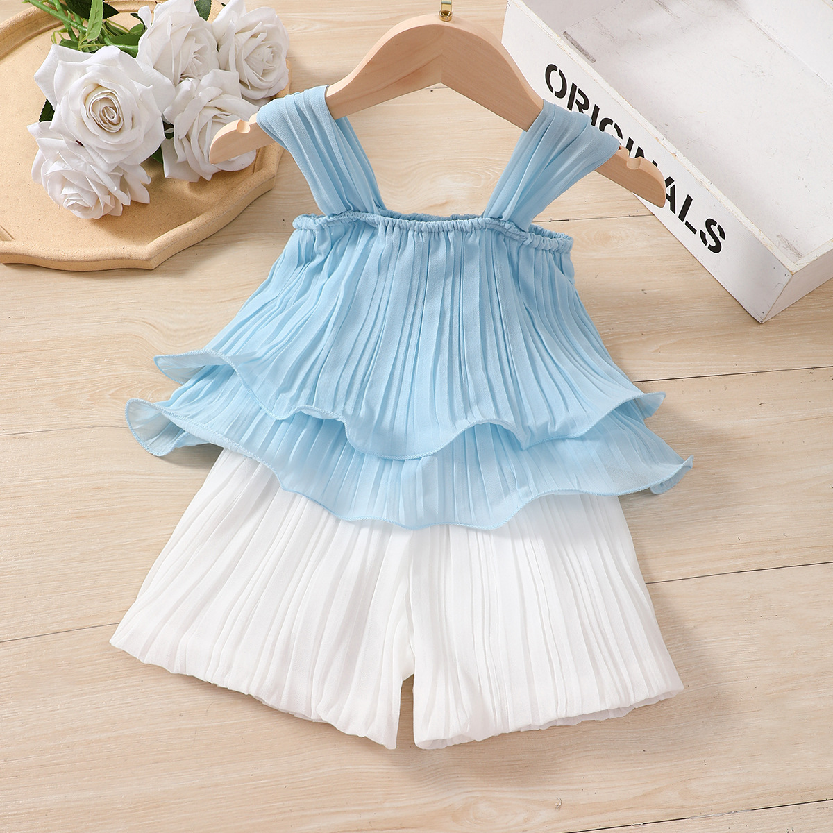 크로스 보더 INS 어린이와 소녀 여름 주름 쉬폰 슬링 단색 스커트 탑 반바지 해변 세트