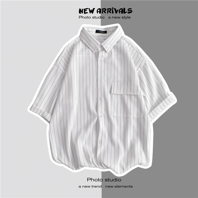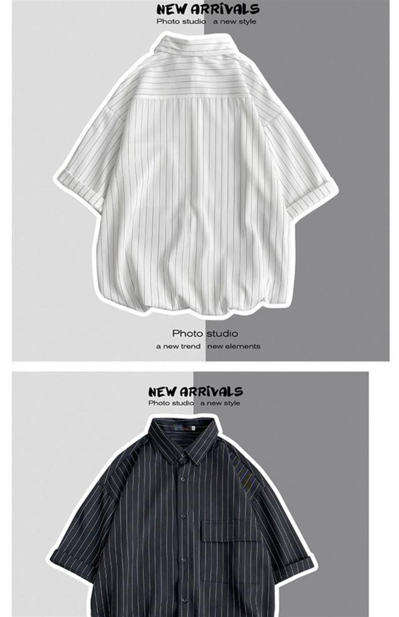 남자 여름 2023 홍콩 스타일 일본식 캐주얼 느슨한 세로 줄무늬 셔츠 반팔 한국식 반팔 셔츠