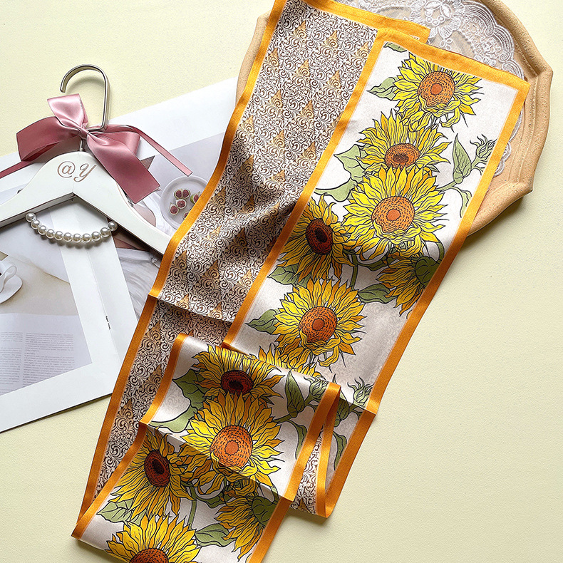 해바라기 실크 인쇄 더블 레이어 리본 유화 스타일 시리즈 뽕나무 실크 새틴 양면 인쇄 스카프 여성용 헤어 밴드