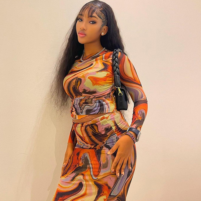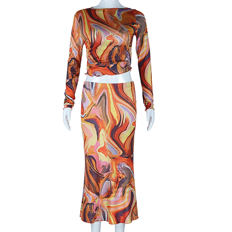 유럽풍 프린트 라운드넥 긴팔 크롭탑 힙허깅 스커트 세트 여성 원피스 드레스 패션