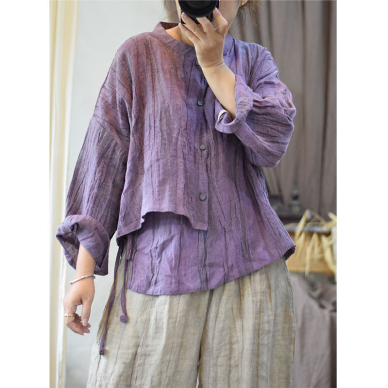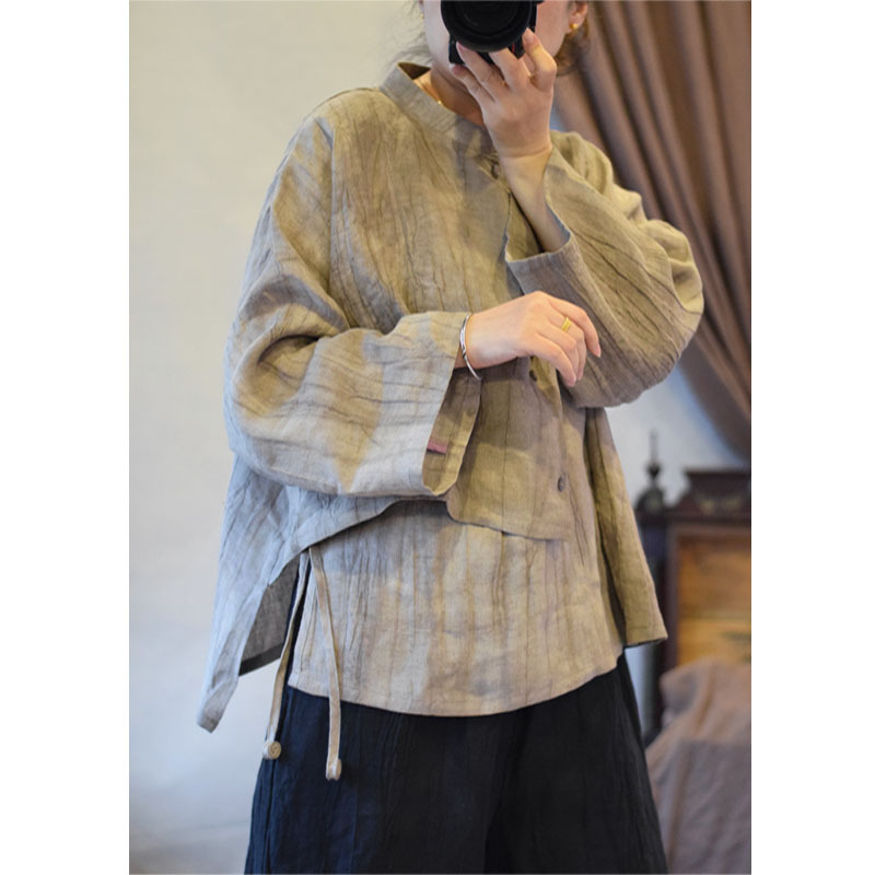 원래 불규칙한 질감 구겨짐 순수한 린넨 작은 스탠드 칼라 레이스 업 복고풍 스타일 여성 셔츠 탑 작은 셔츠