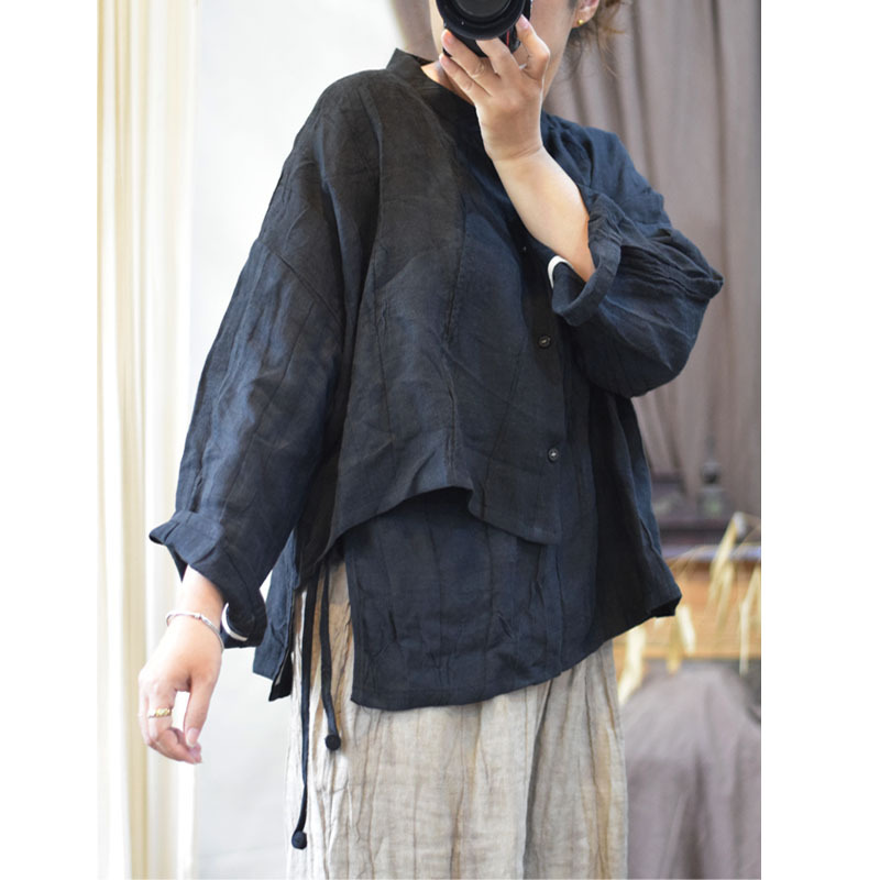 원래 불규칙한 질감 구겨짐 순수한 린넨 작은 스탠드 칼라 레이스 업 복고풍 스타일 여성 셔츠 탑 작은 셔츠스토어 가기