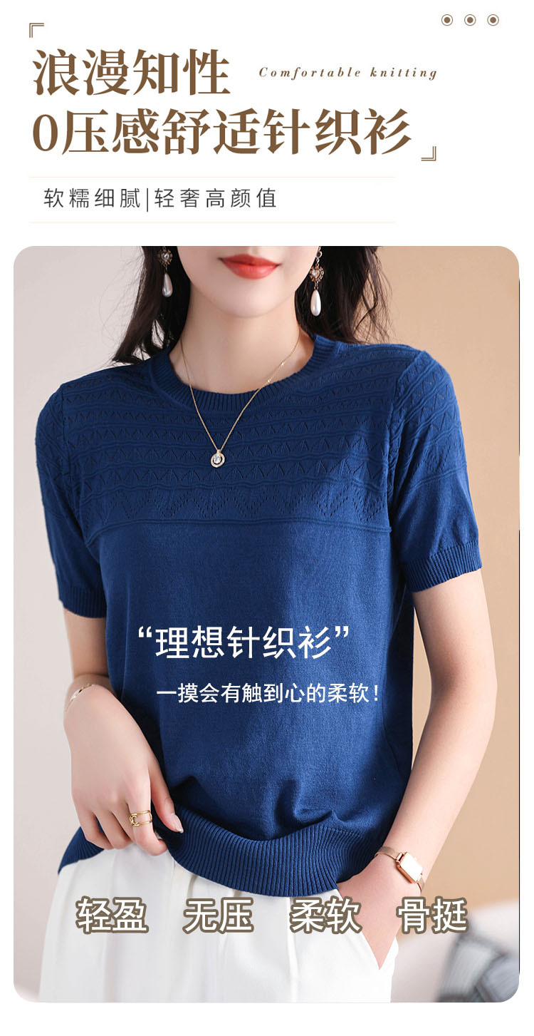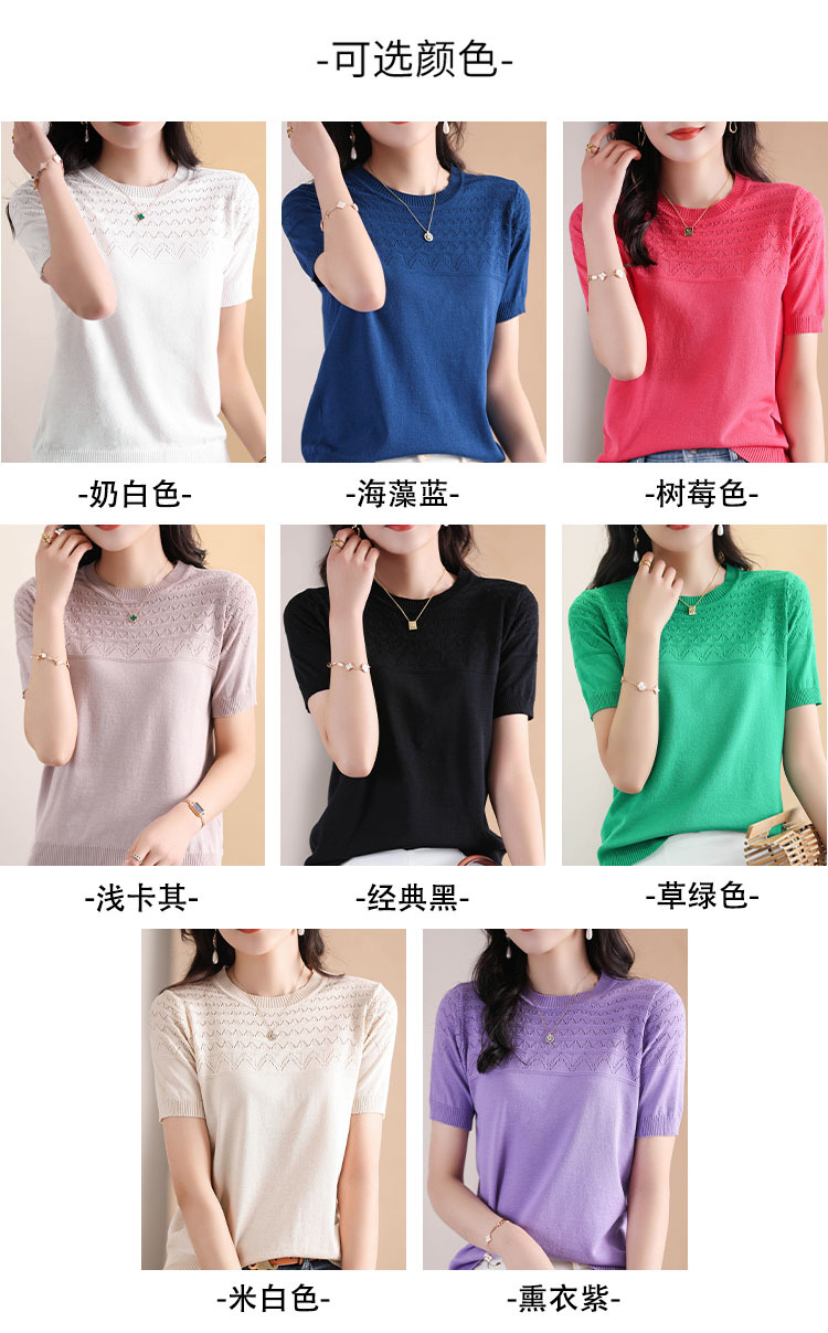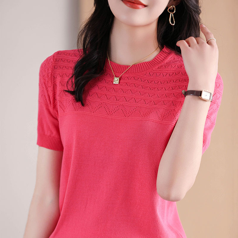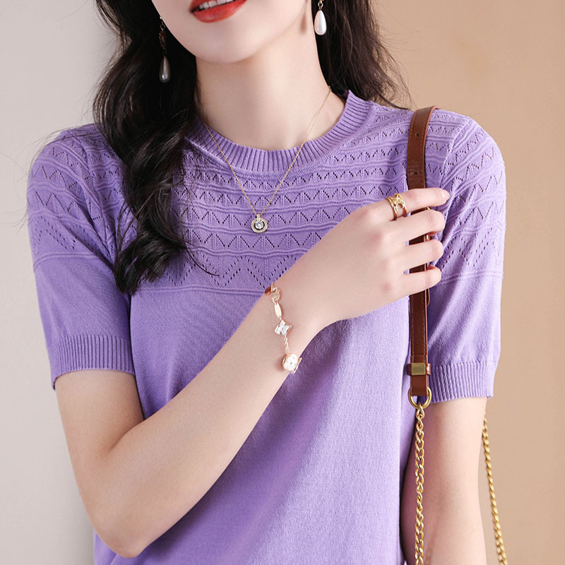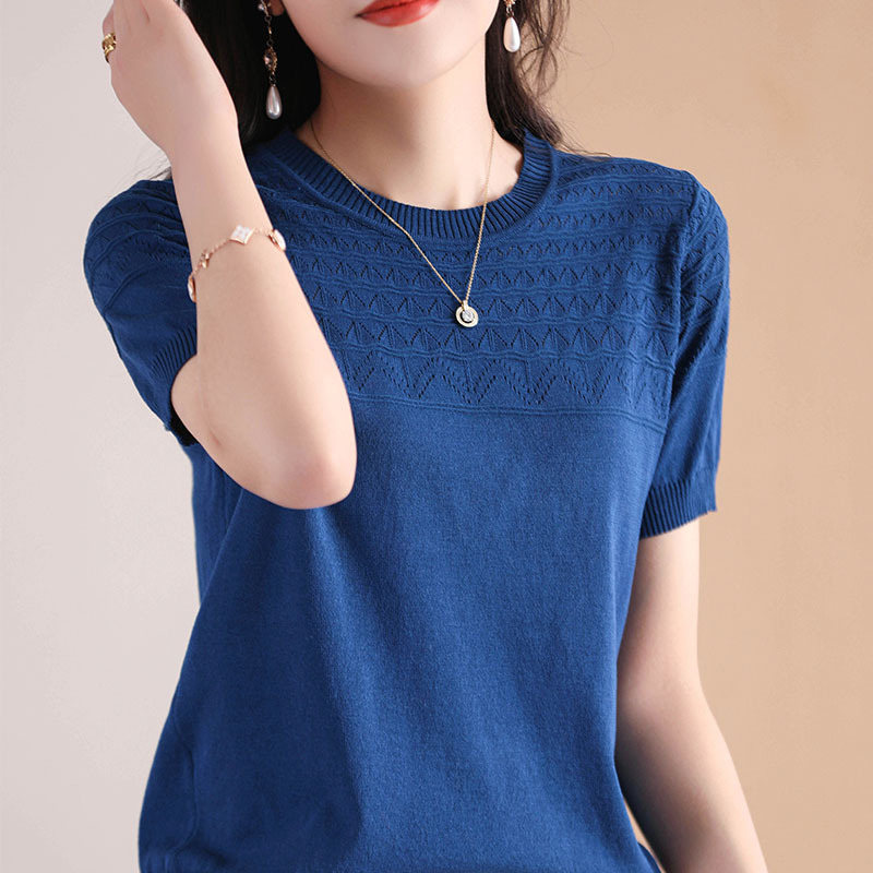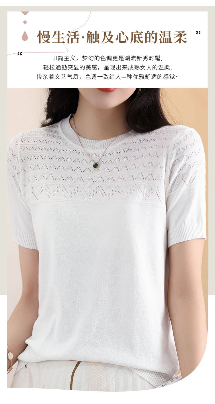 아이스 실크 2023 여름 새로운 여성용 풀오버 짧은 티셔츠 중공 단색 우아한 모든 매치 라운드 넥 니트스토어 가기