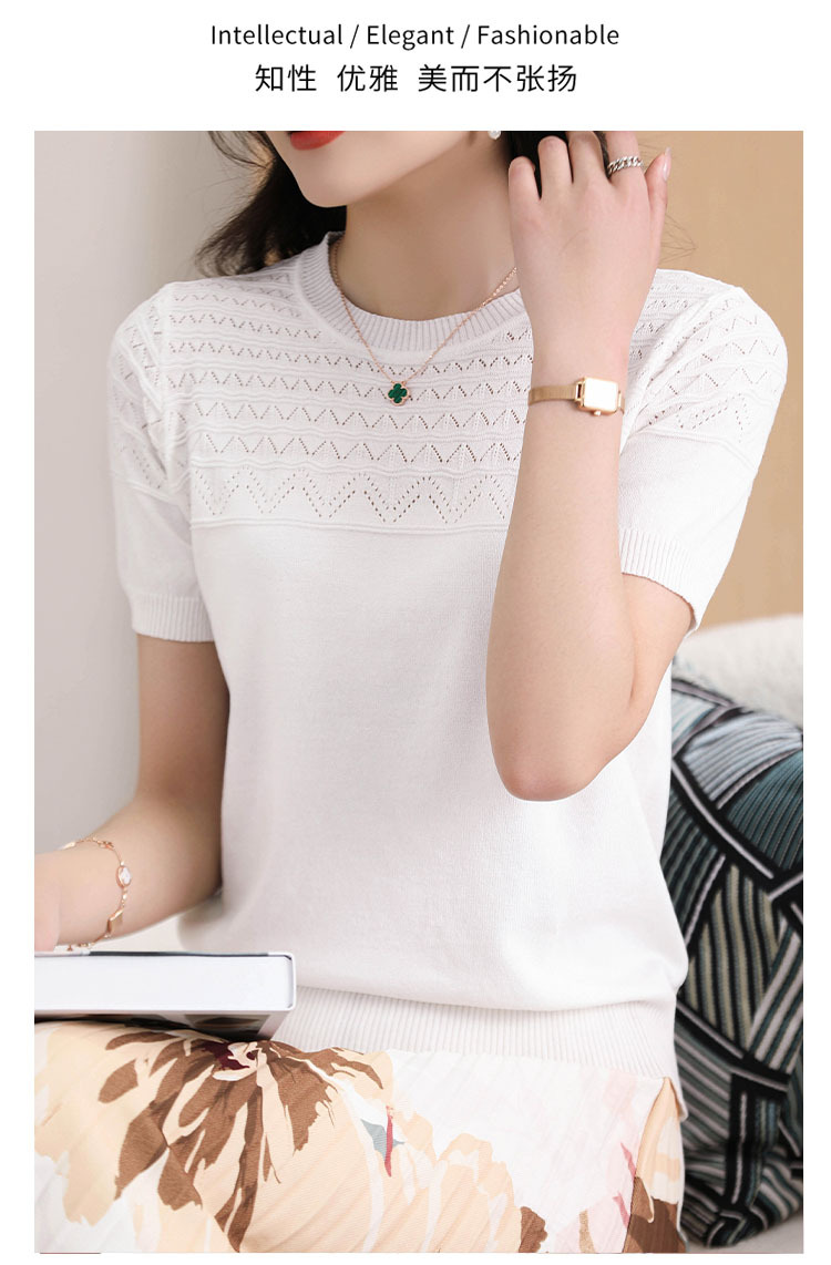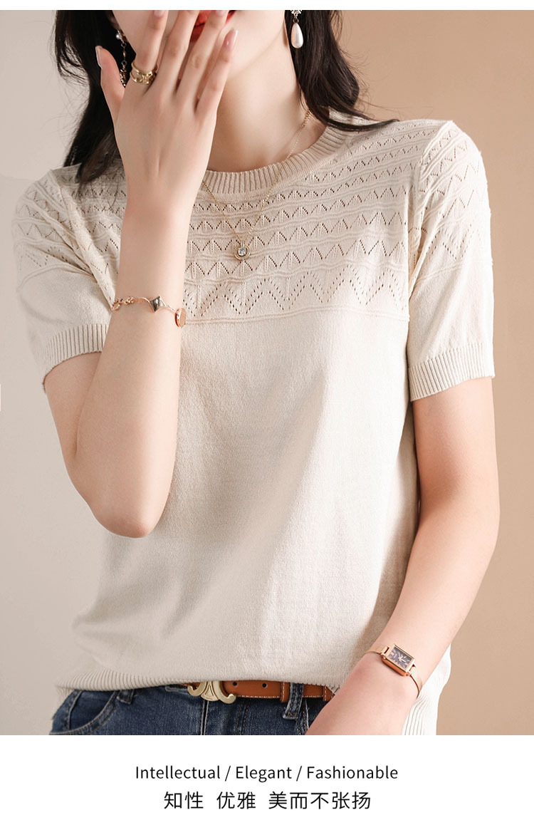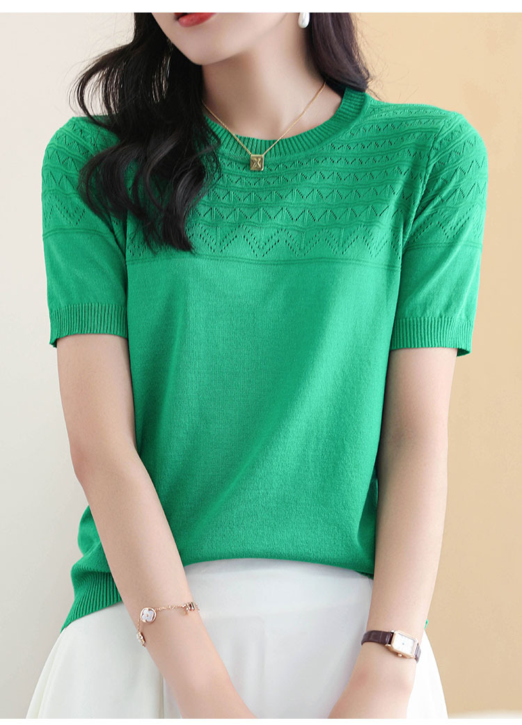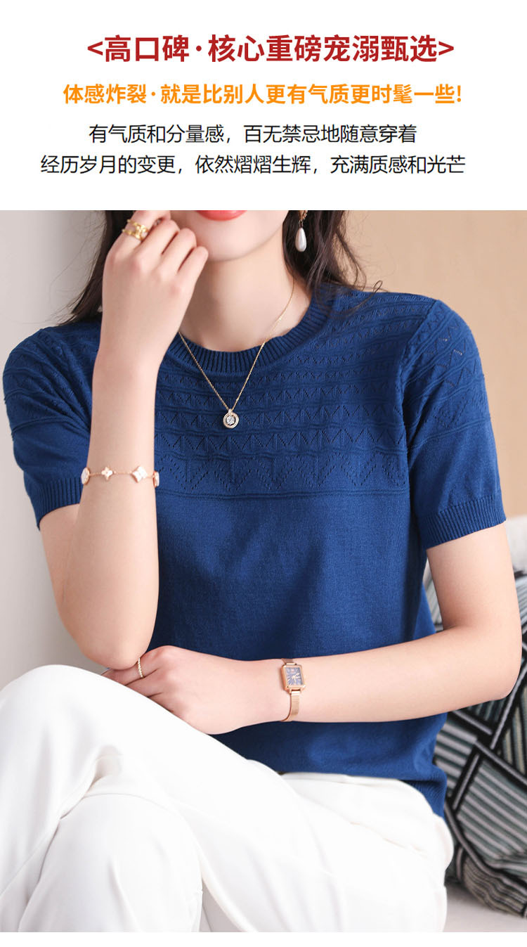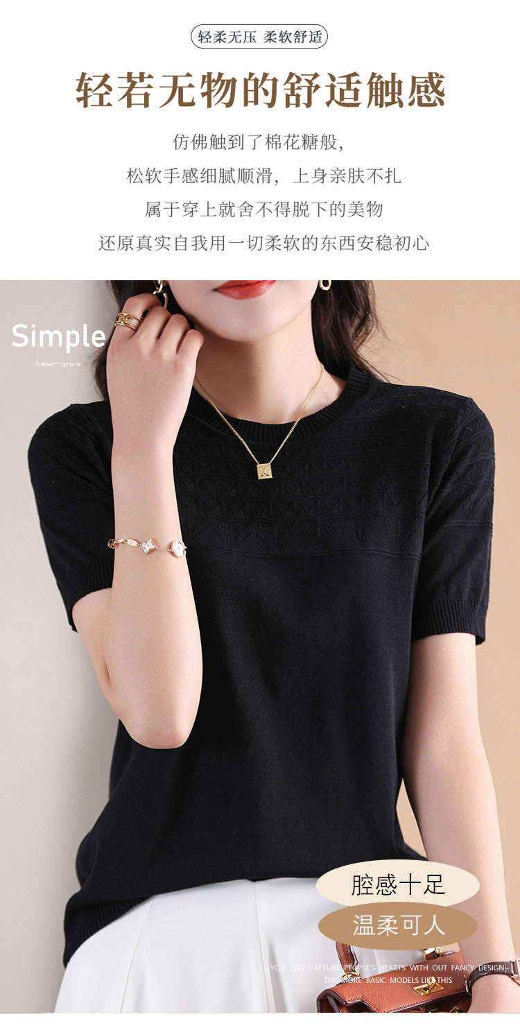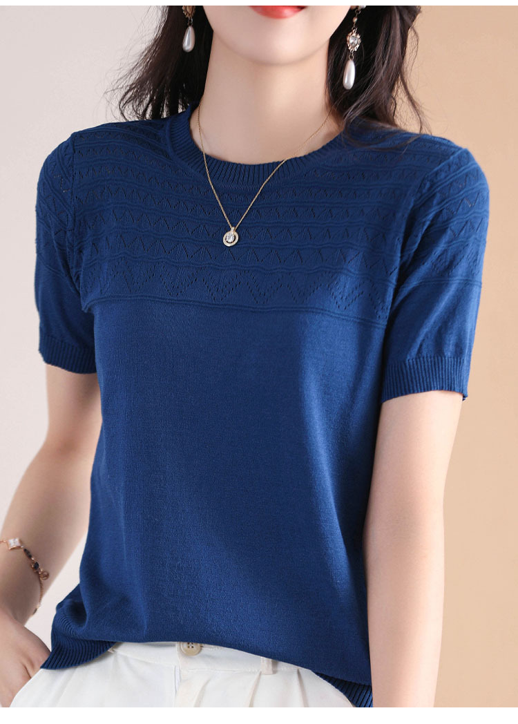 아이스 실크 2023 여름 새로운 여성용 풀오버 짧은 티셔츠 중공 단색 우아한 모든 매치 라운드 넥 니트스토어 가기