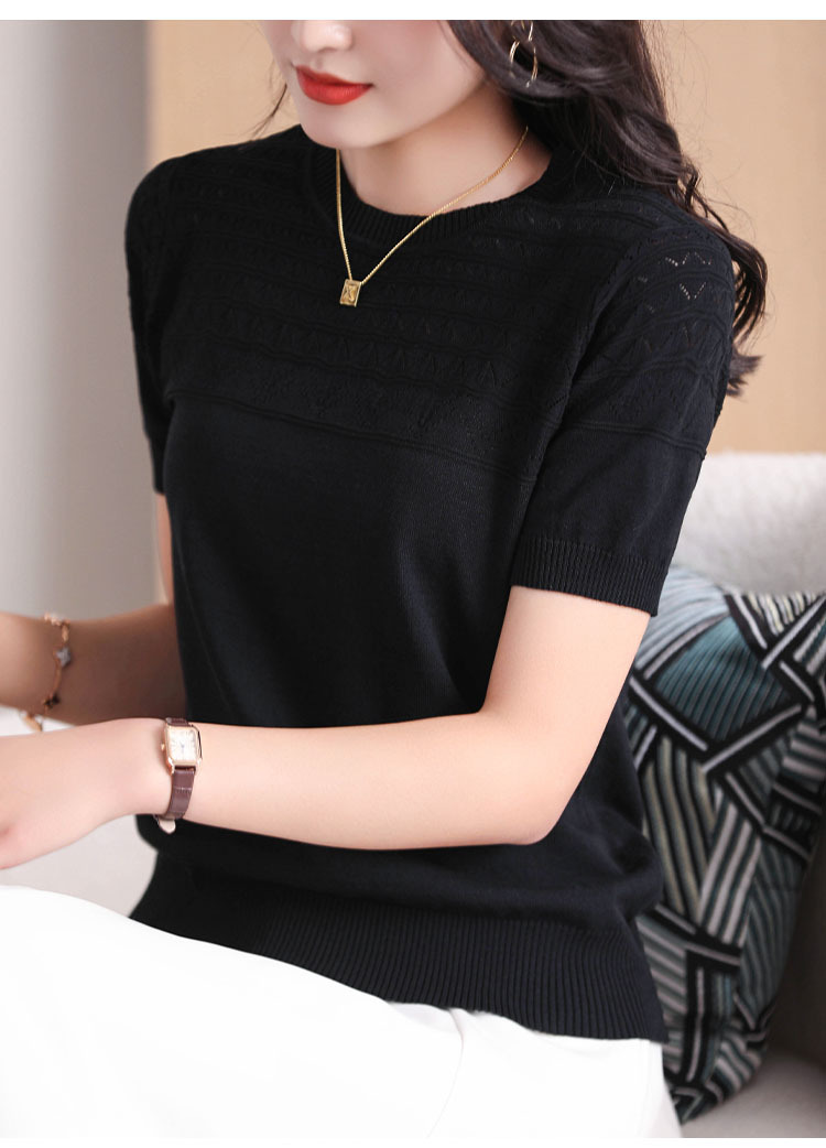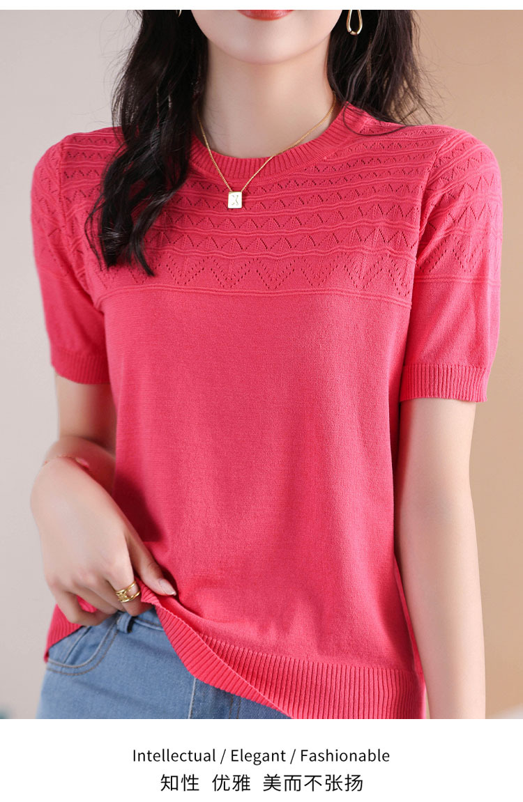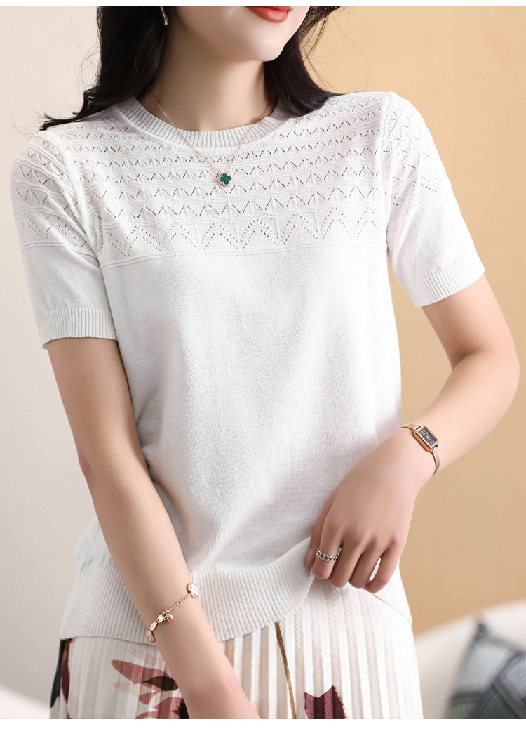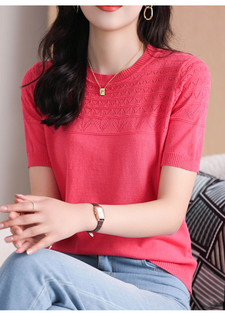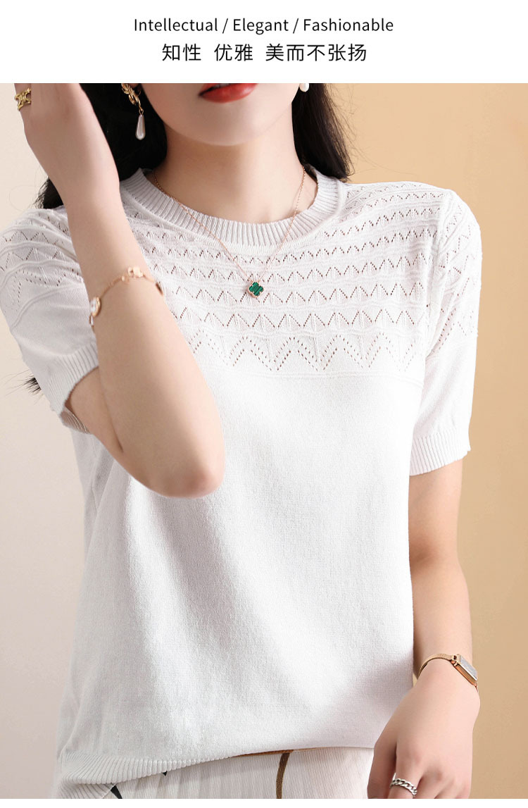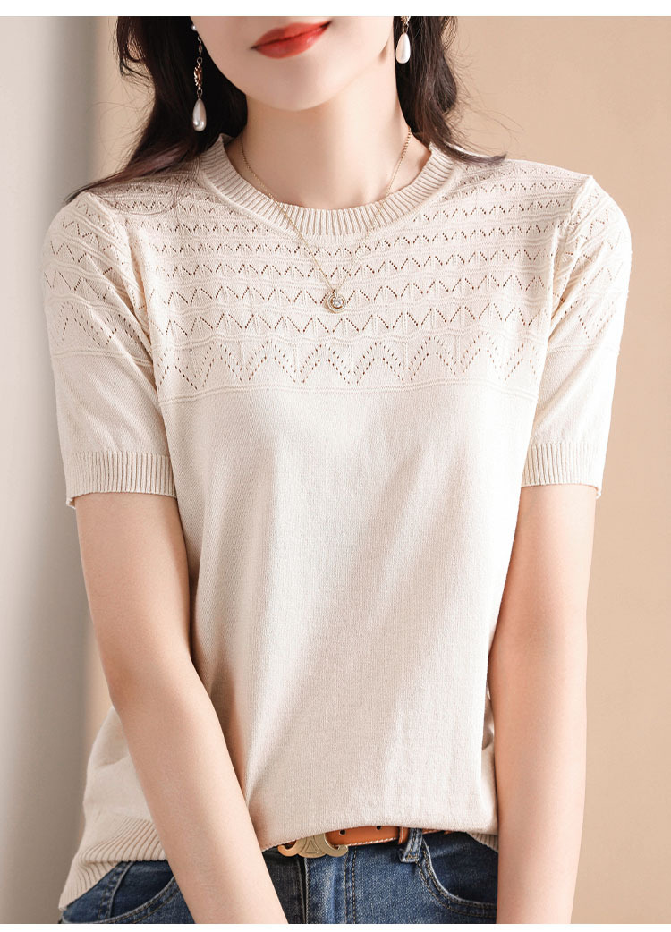 아이스 실크 2023 여름 새로운 여성용 풀오버 짧은 티셔츠 중공 단색 우아한 모든 매치 라운드 넥 니트스토어 가기