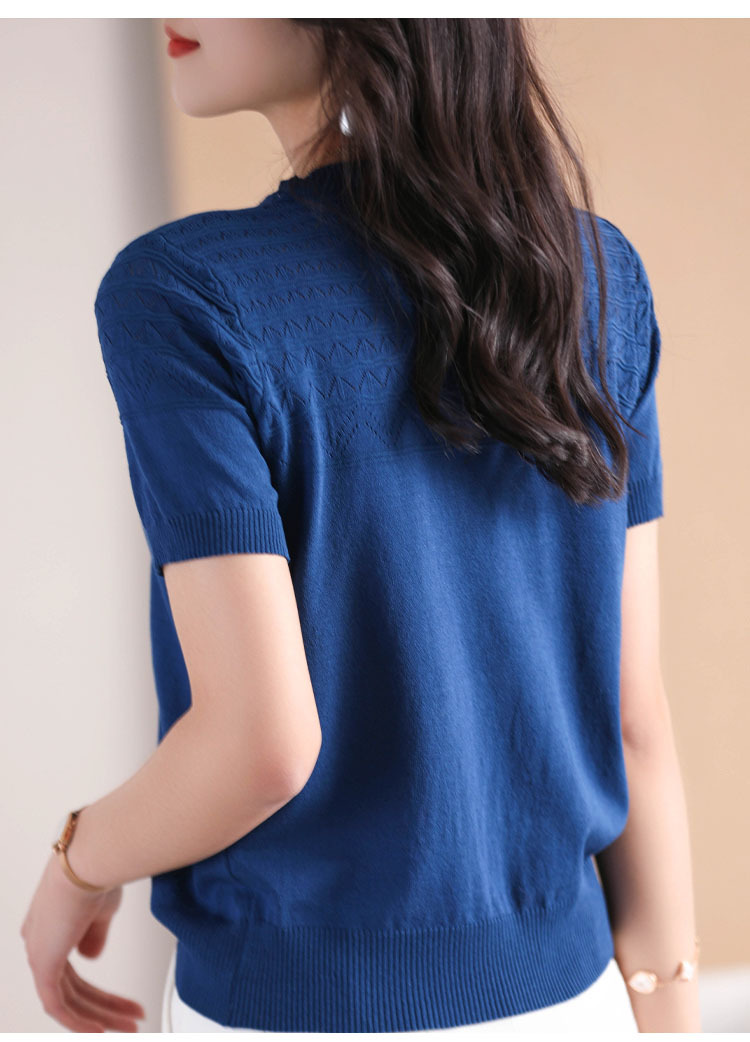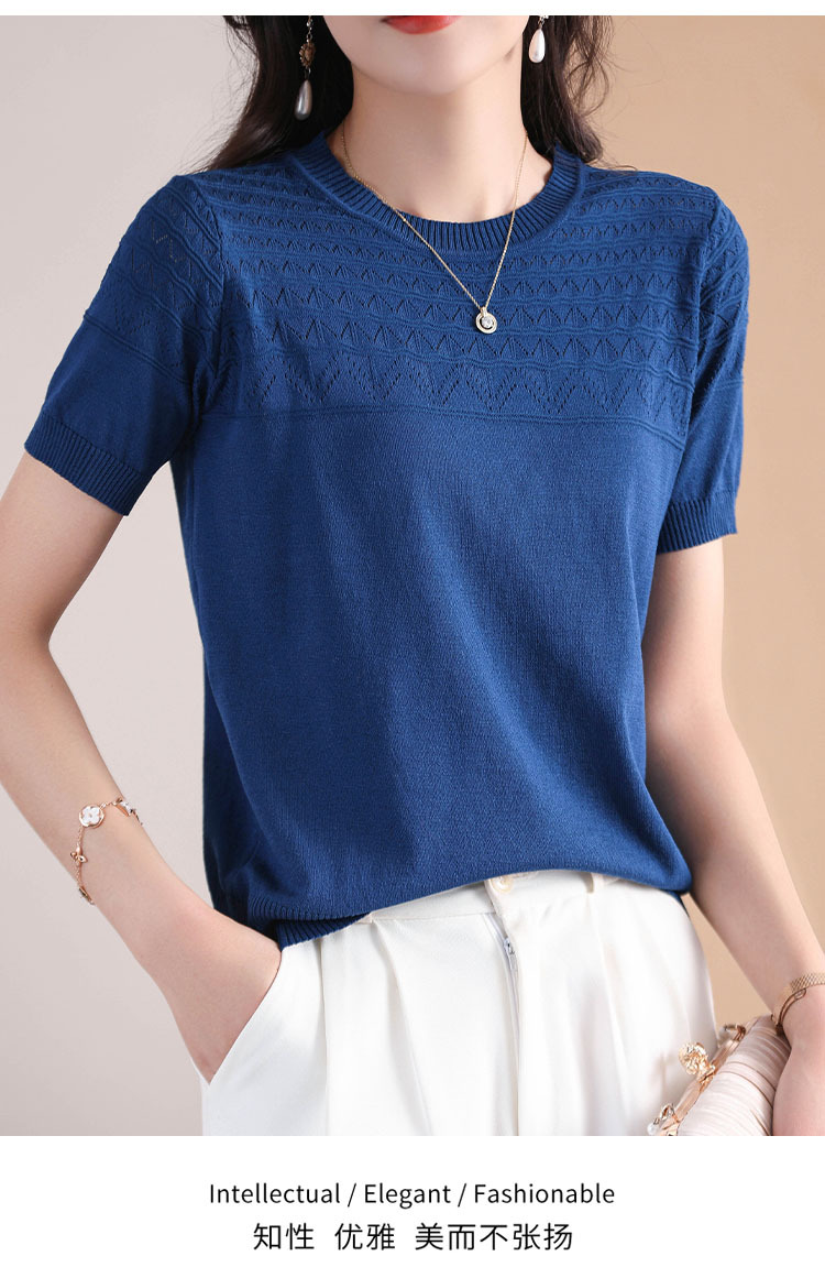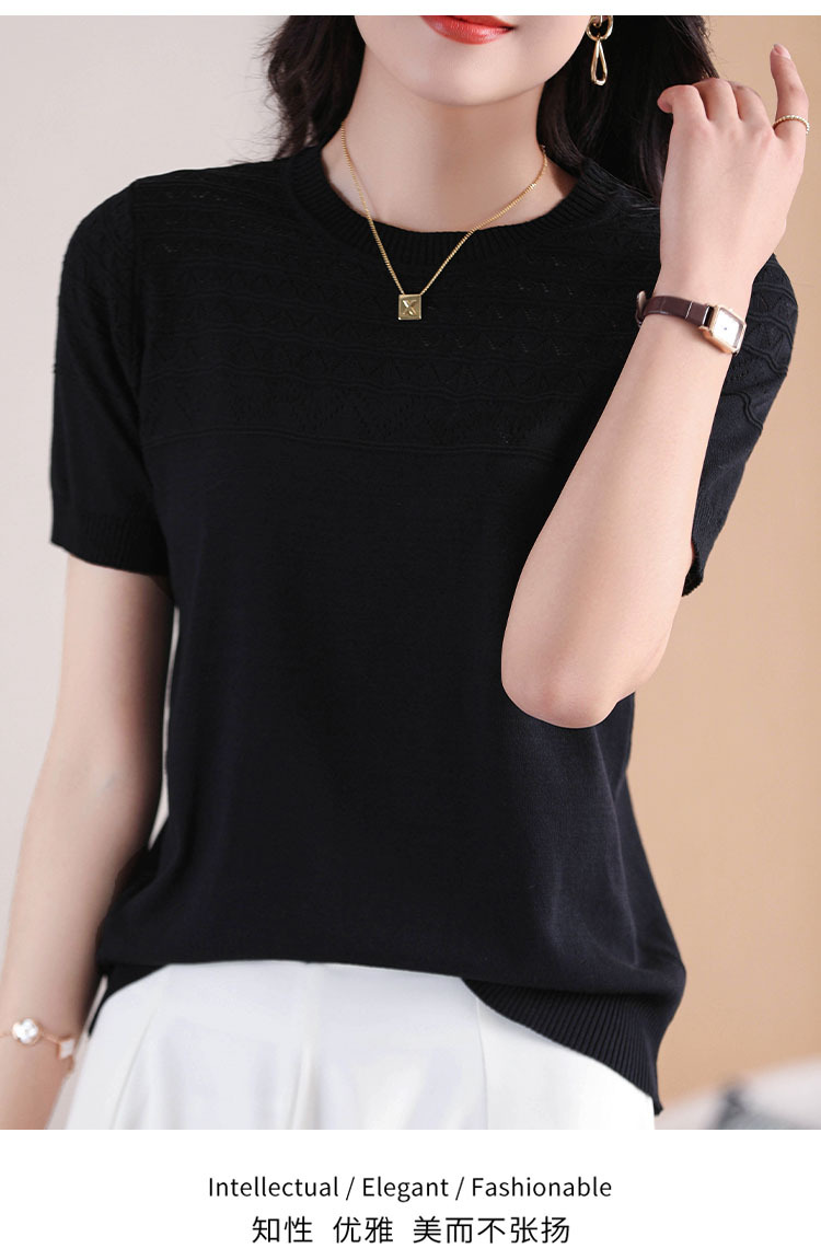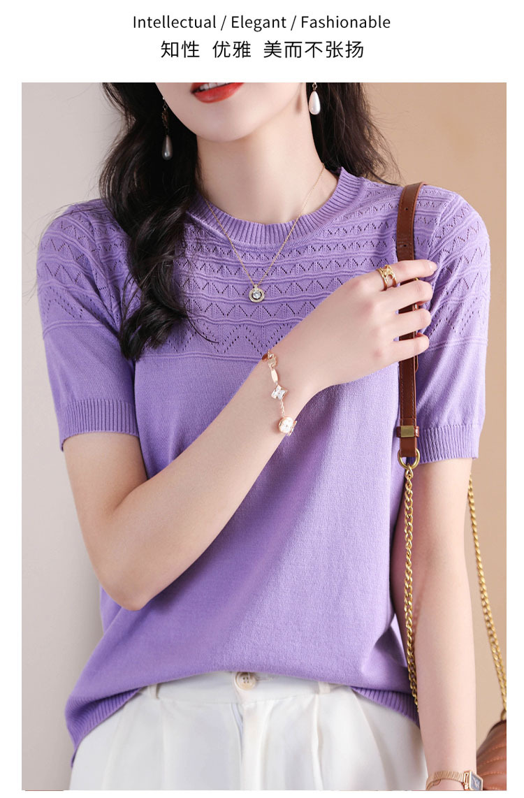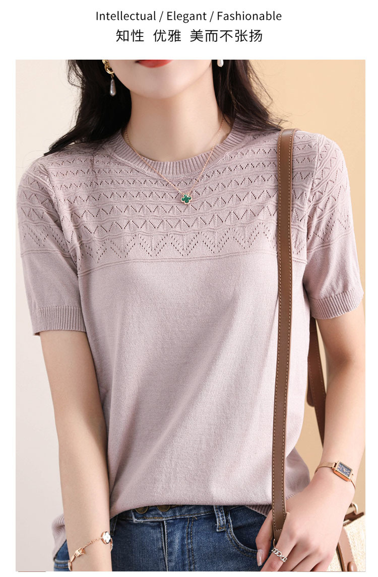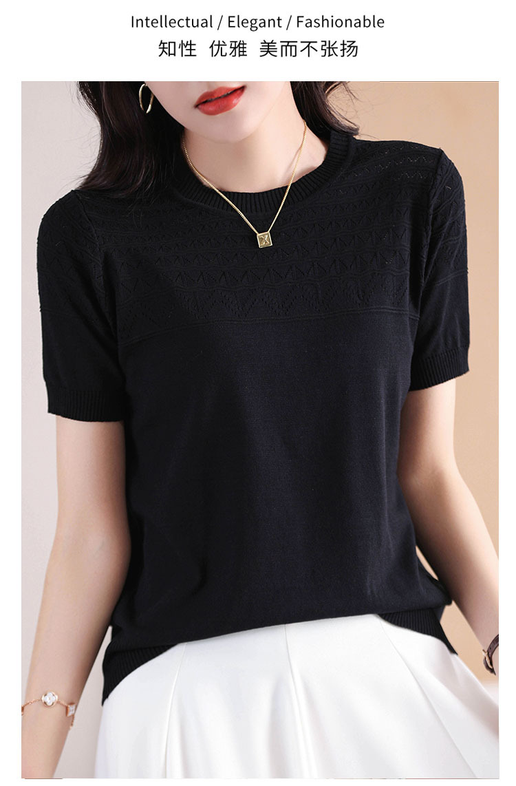 아이스 실크 2023 여름 새로운 여성용 풀오버 짧은 티셔츠 중공 단색 우아한 모든 매치 라운드 넥 니트스토어 가기