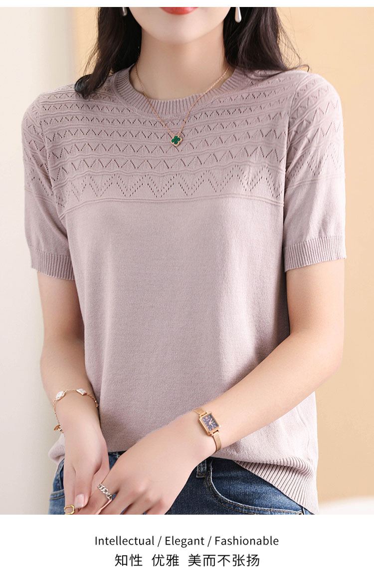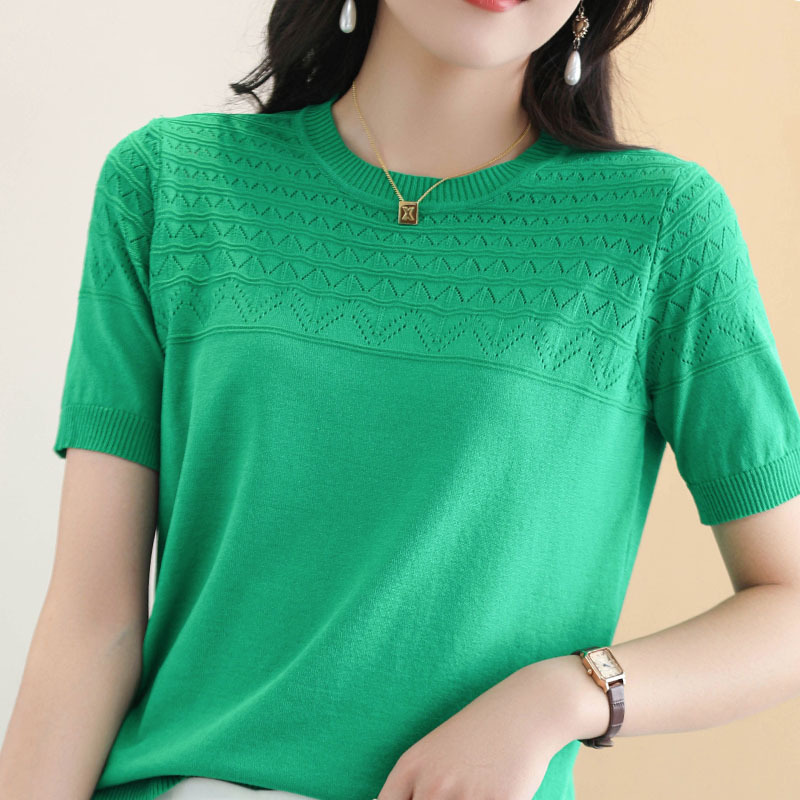 아이스 실크 2023 여름 새로운 여성용 풀오버 짧은 티셔츠 중공 단색 우아한 모든 매치 라운드 넥 니트