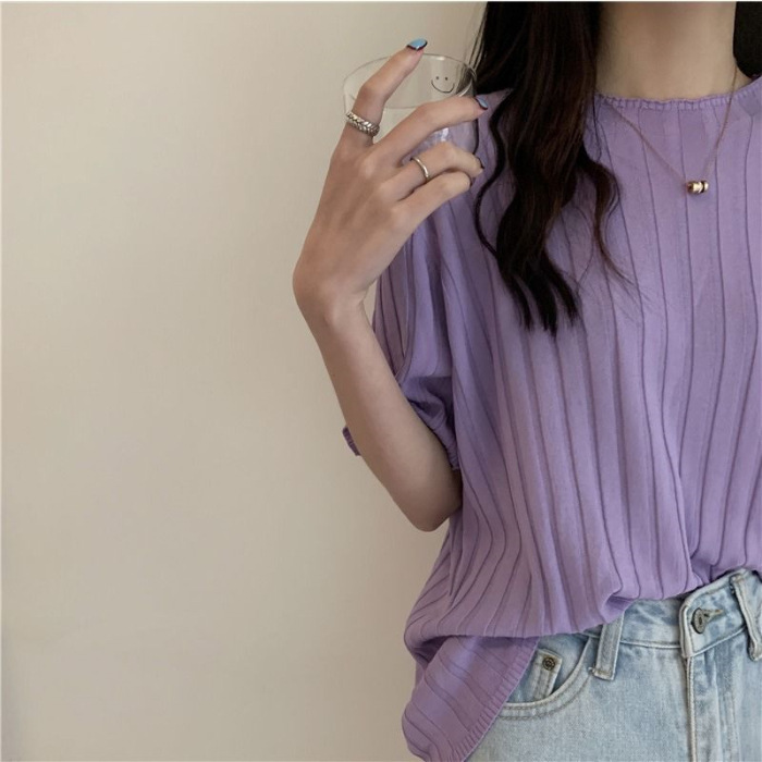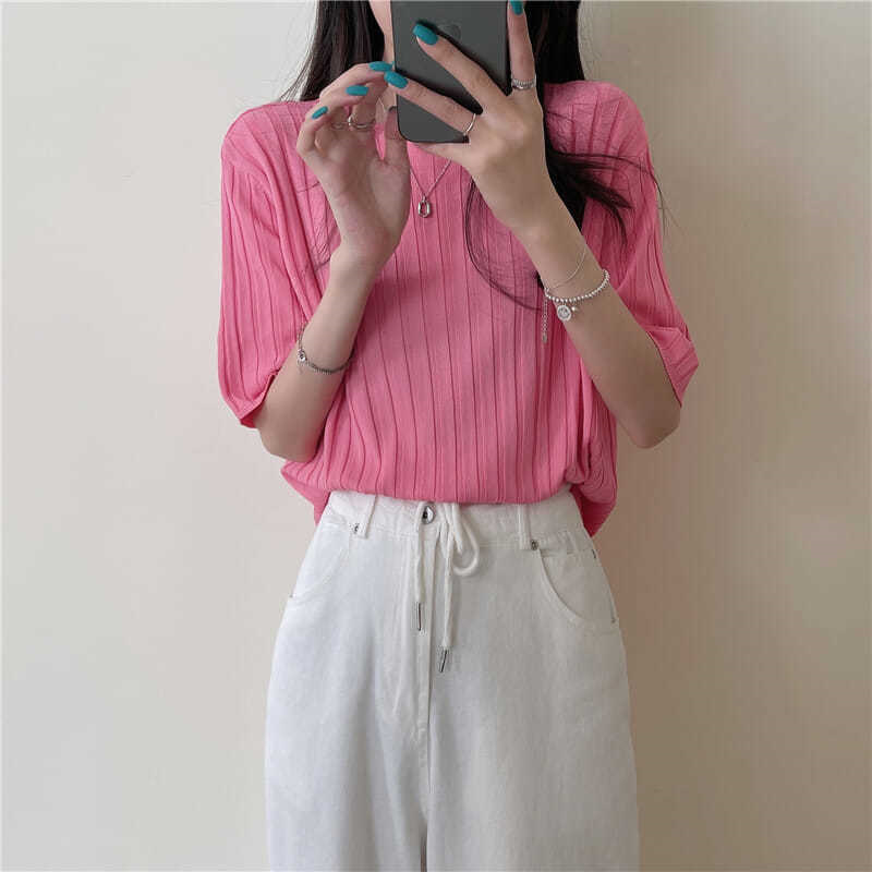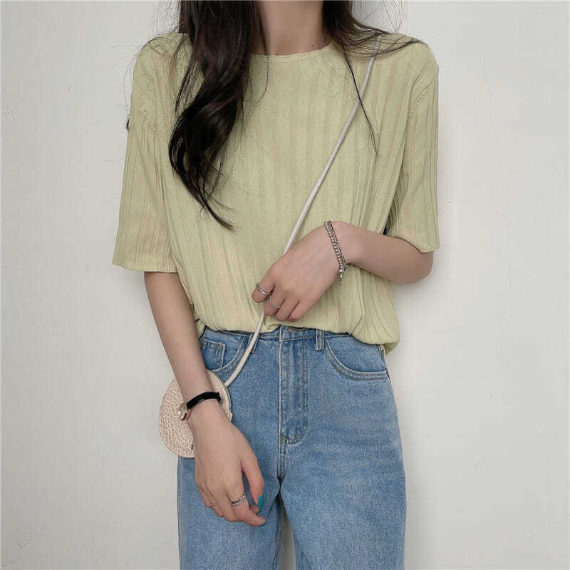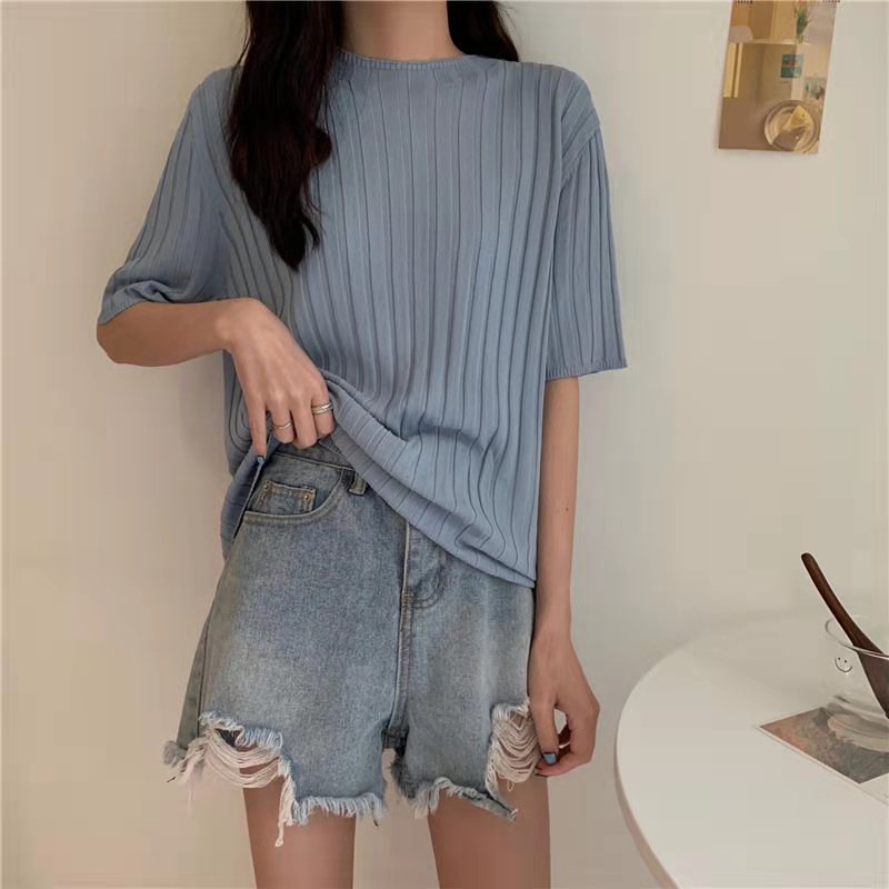 아이스 실크 티셔츠 여성용 얇은 반팔 니트 스웨터 2023 플러스 사이즈 느슨한 슬리밍 중간 소매 베이스 라운드 넥 캐주얼 탑스토어 가기