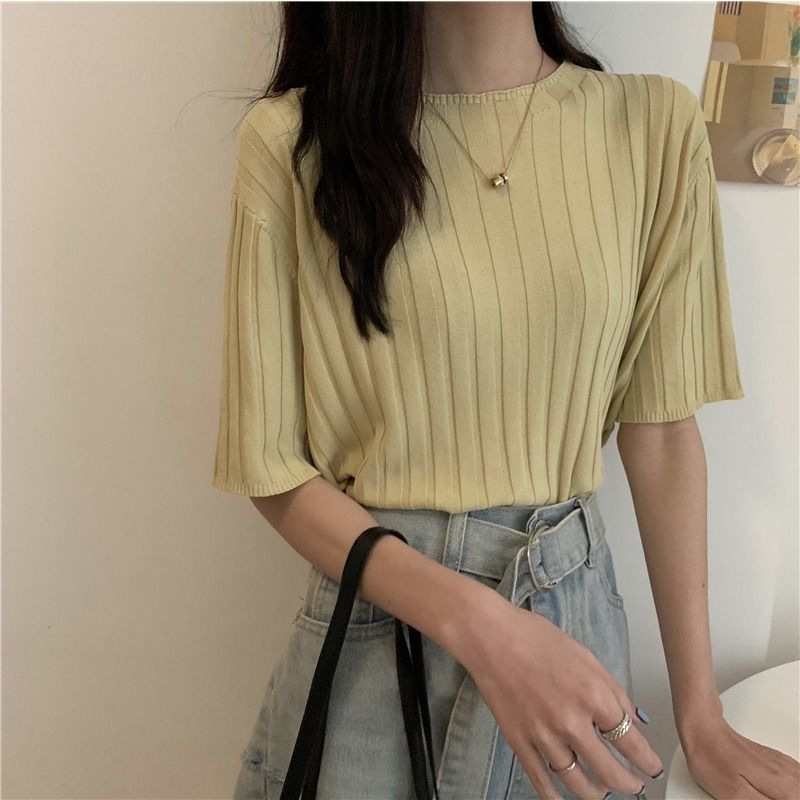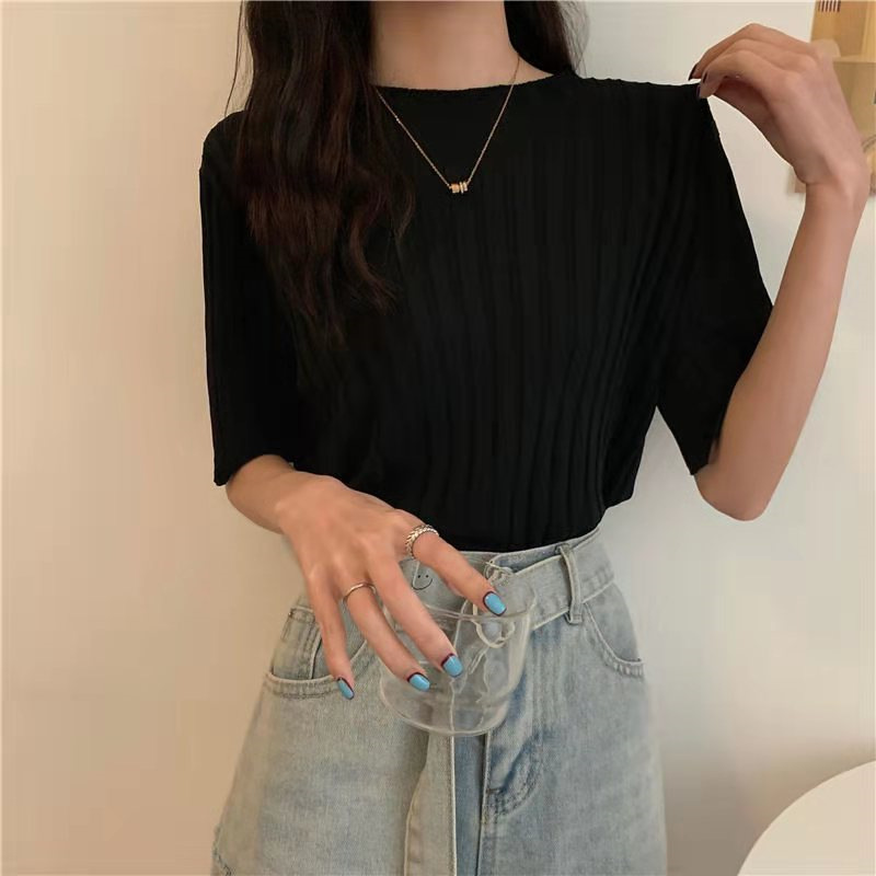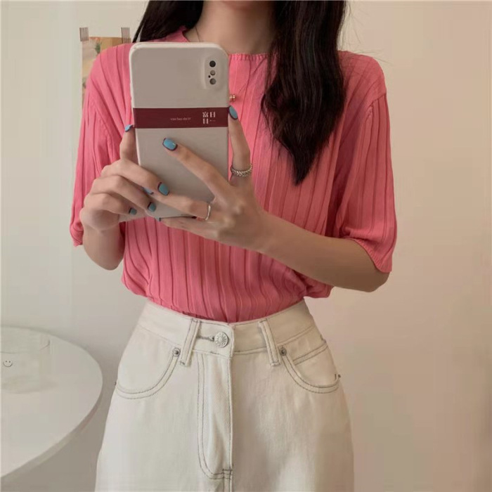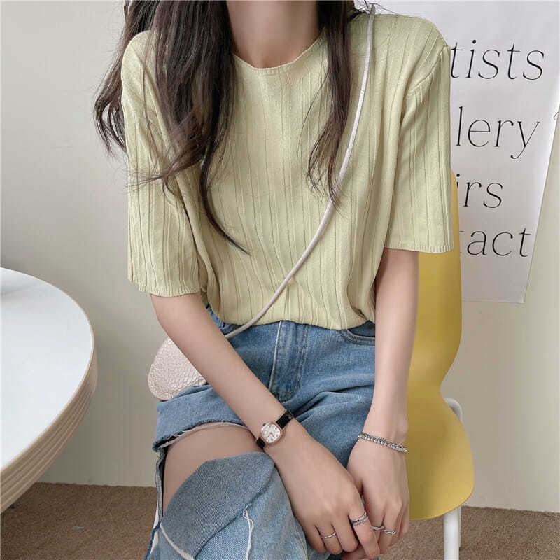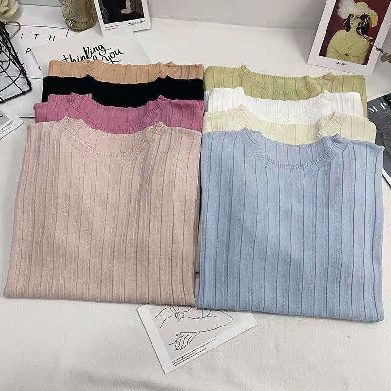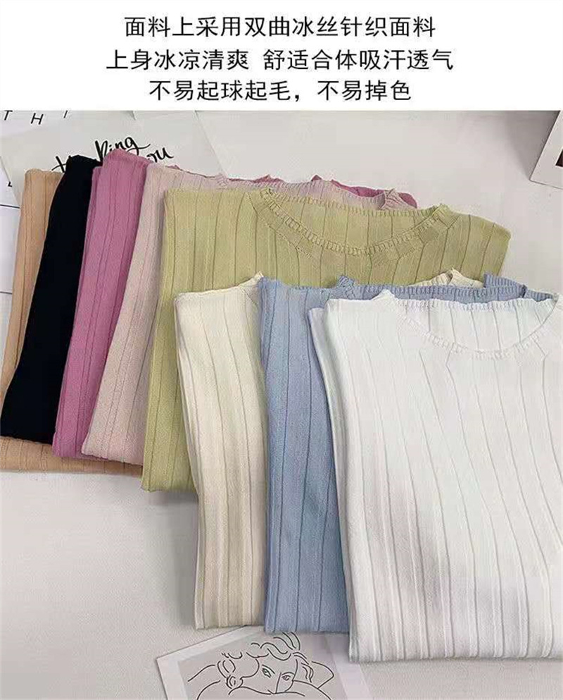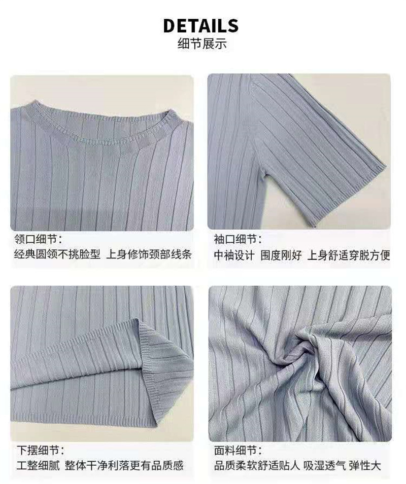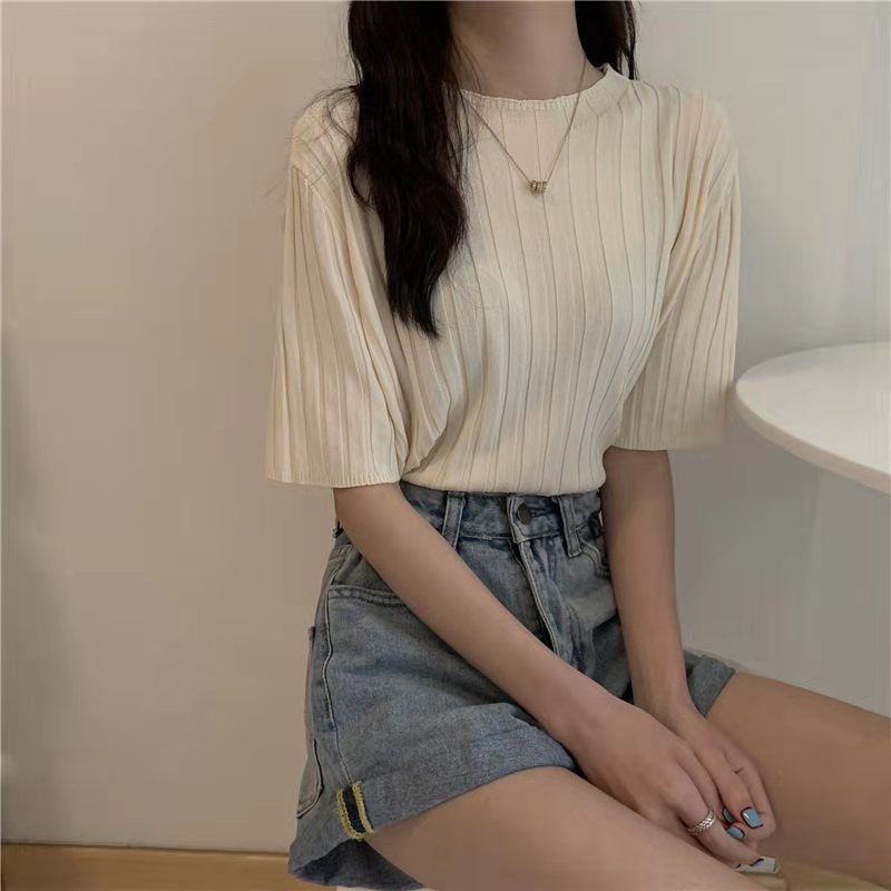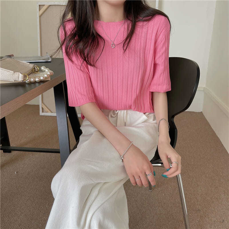 아이스 실크 티셔츠 여성용 얇은 반팔 니트 스웨터 2023 플러스 사이즈 느슨한 슬리밍 중간 소매 베이스 라운드 넥 캐주얼 탑