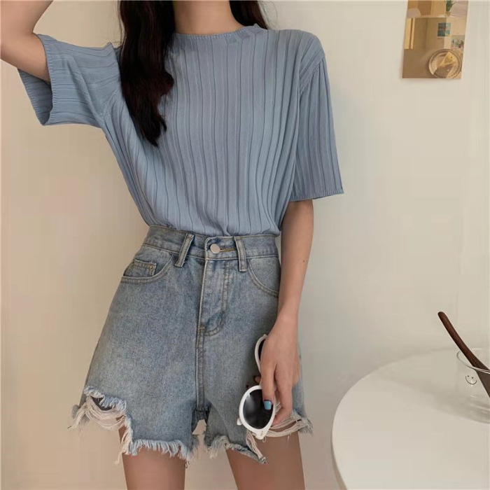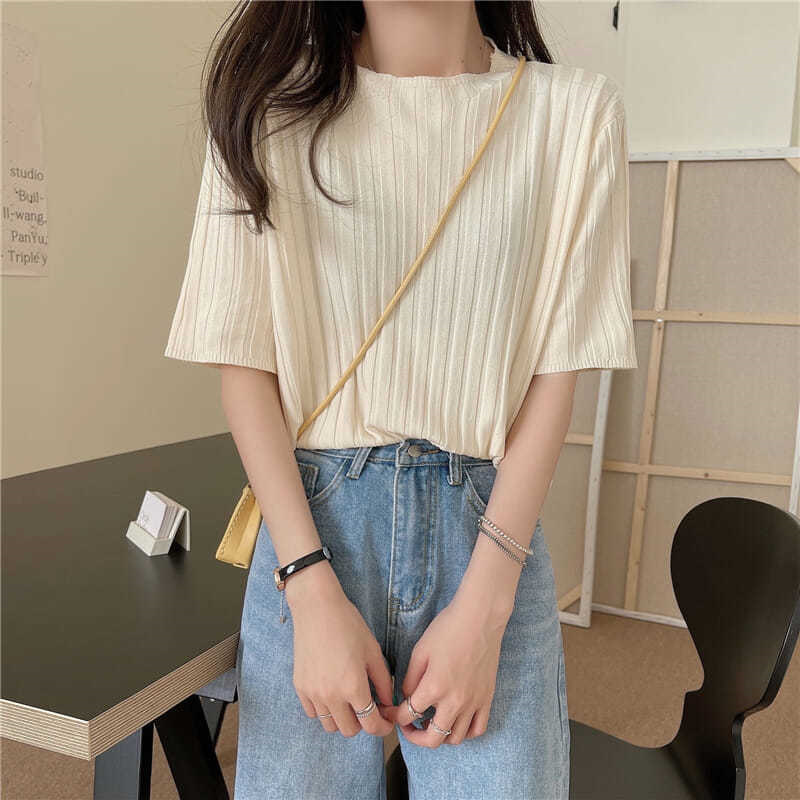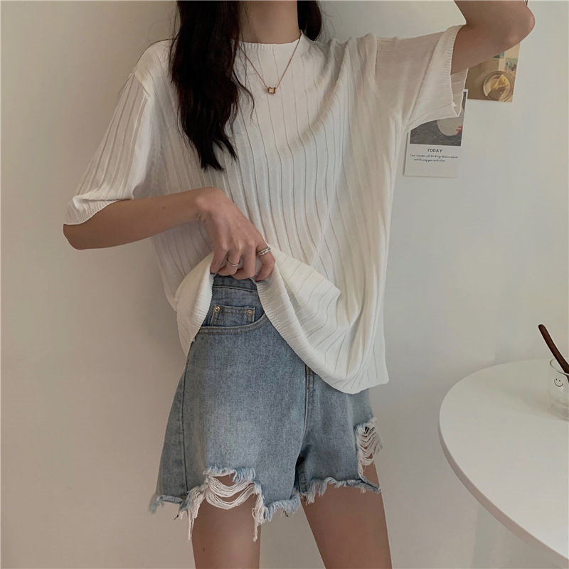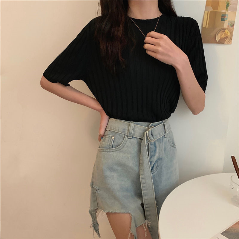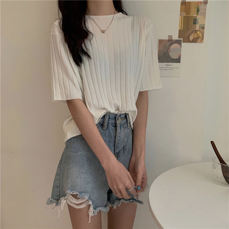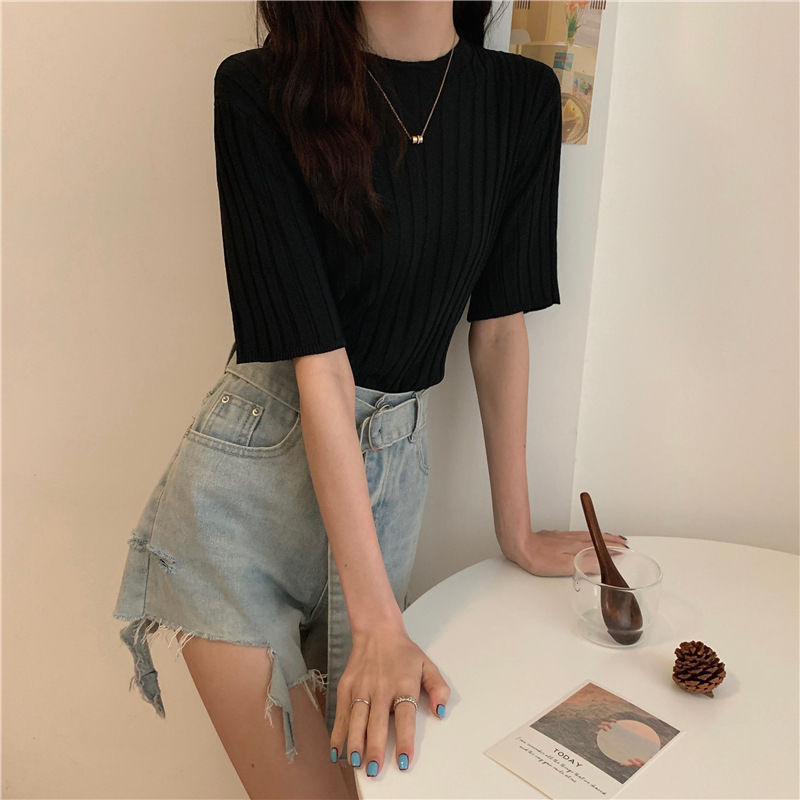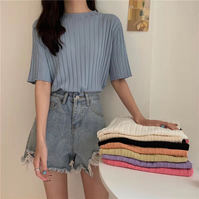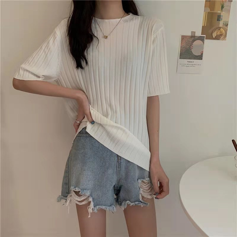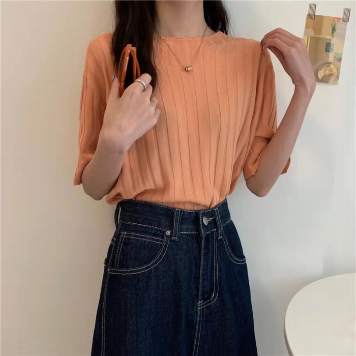 아이스 실크 티셔츠 여성용 얇은 반팔 니트 스웨터 2023 플러스 사이즈 느슨한 슬리밍 중간 소매 베이스 라운드 넥 캐주얼 탑