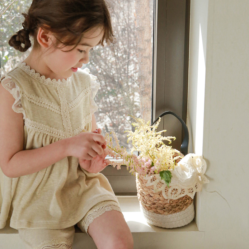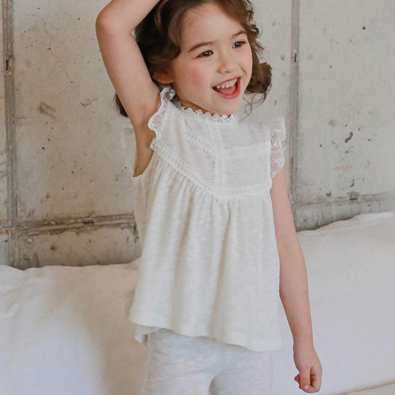 2026 여름 딸기산 한국 아동복 여아용 세련된 레이스 트림 민소매 티셔츠 재고 있음