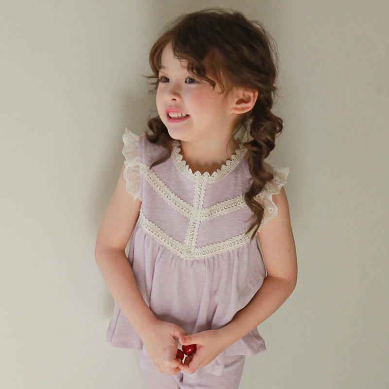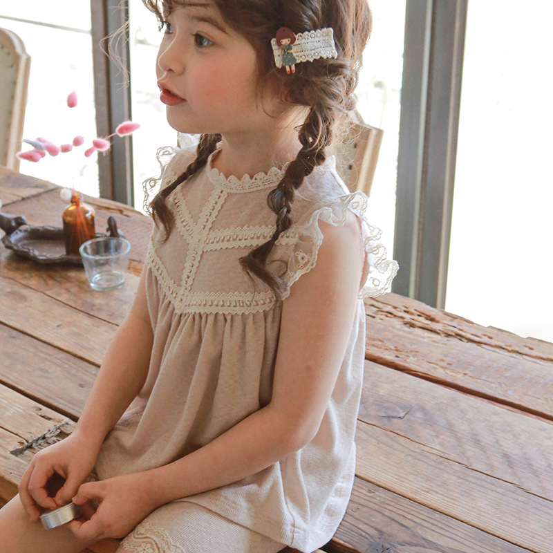 2026 여름 딸기산 한국 아동복 여아용 세련된 레이스 트림 민소매 티셔츠 재고 있음스토어 가기