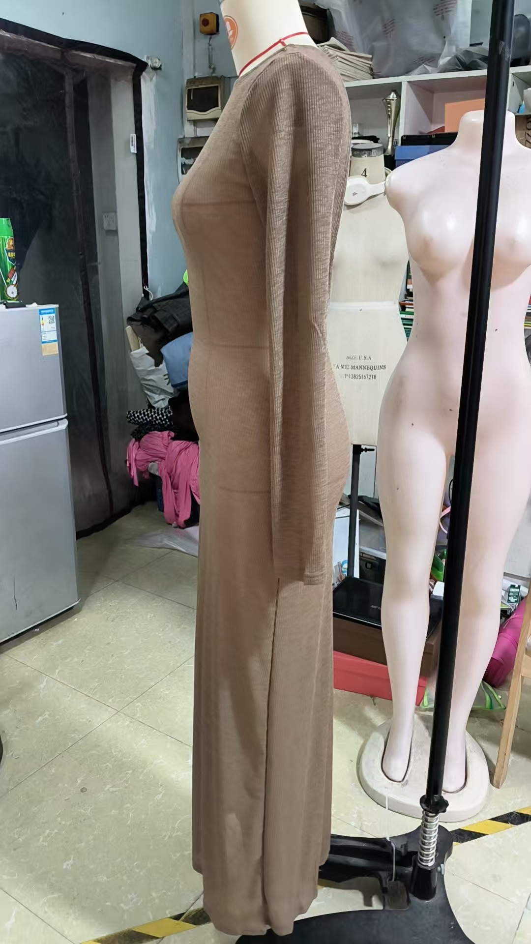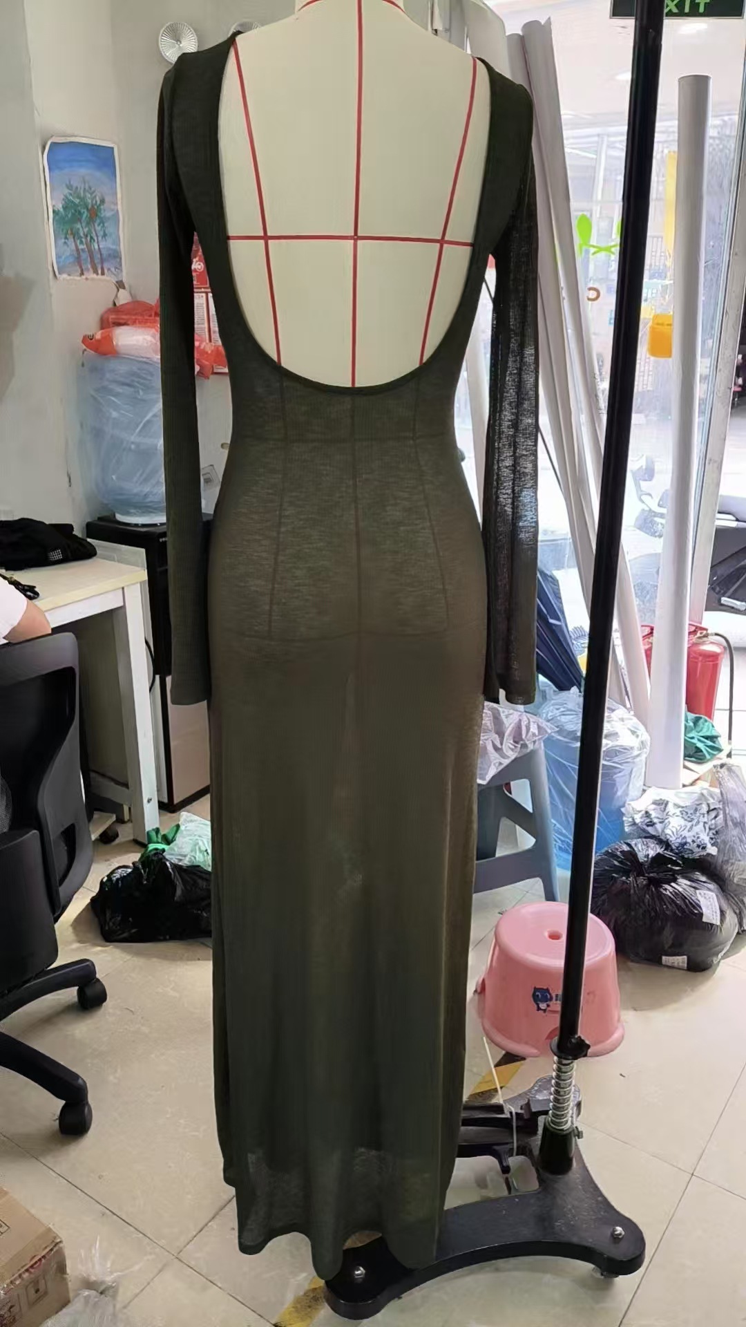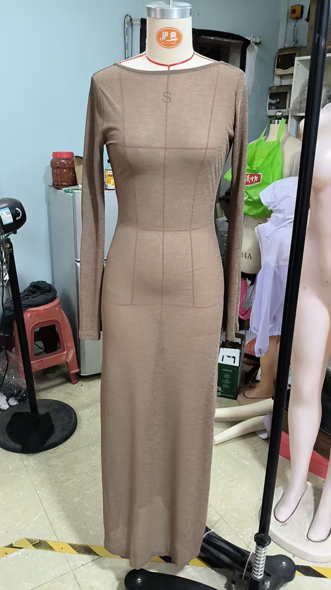 2023 둥근 목 해변 선 스크린 긴 소매 등받이 원피스