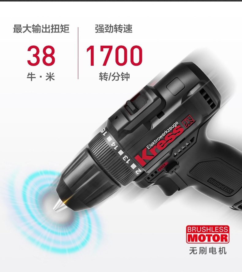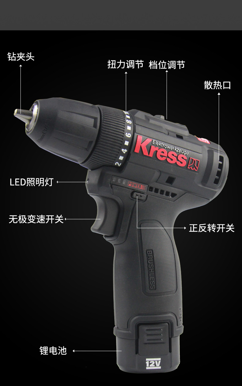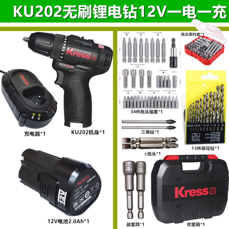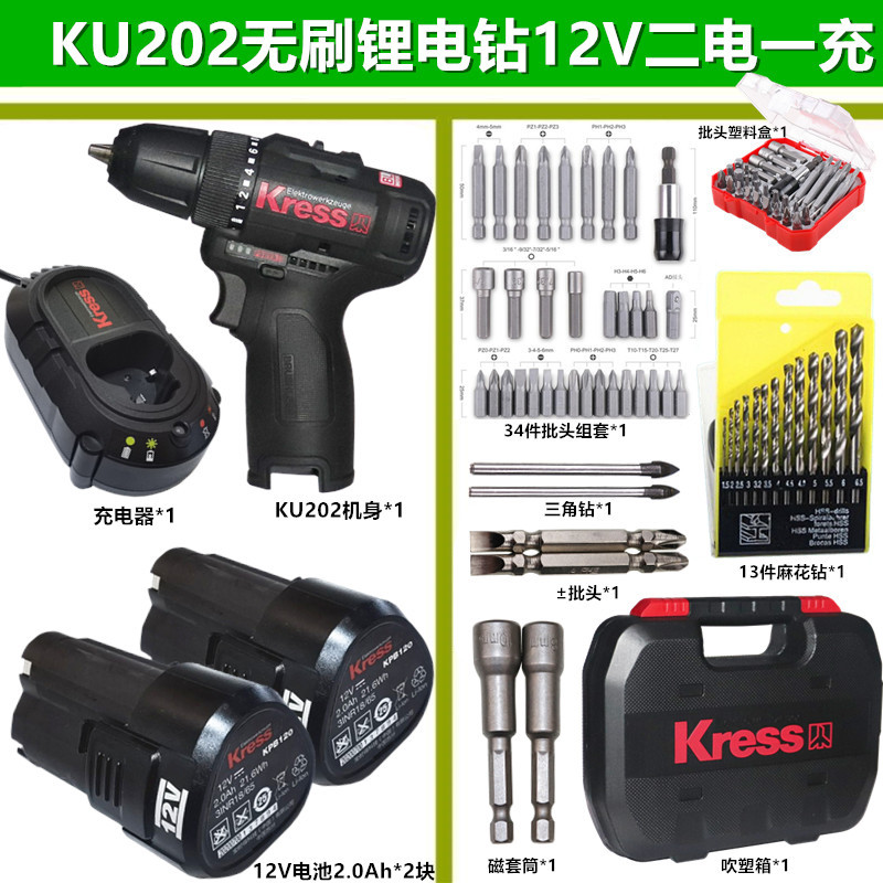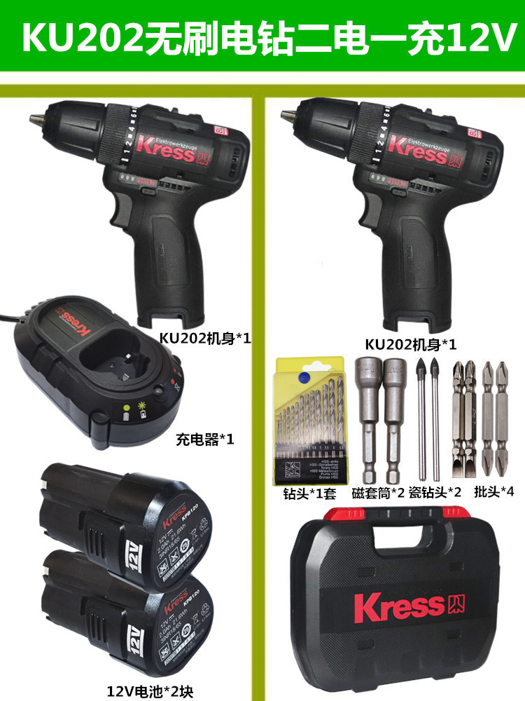 • KU202 브러시리스 전기 드릴, 배터리 2개 및 충전기 1개 12V
