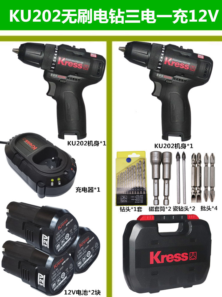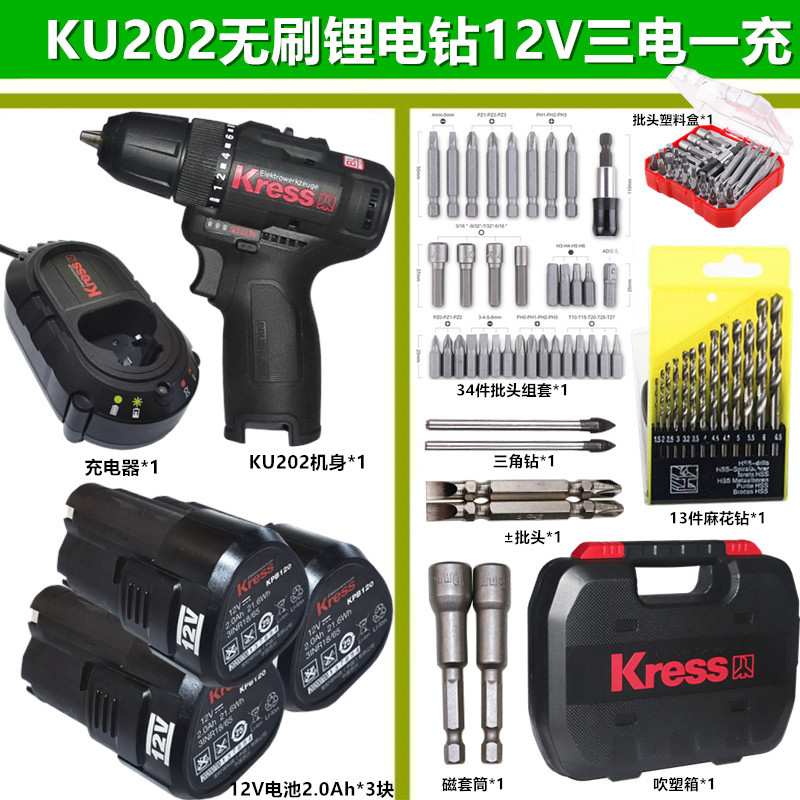 • KU202 브러시리스 전기 드릴, 배터리 3개 및 충전기 1개 12V