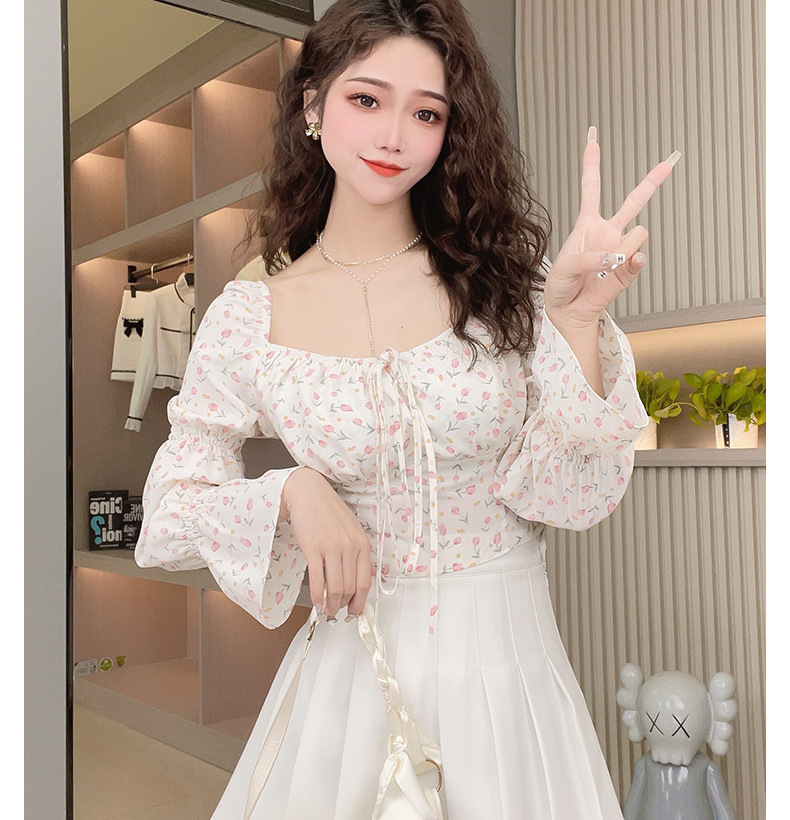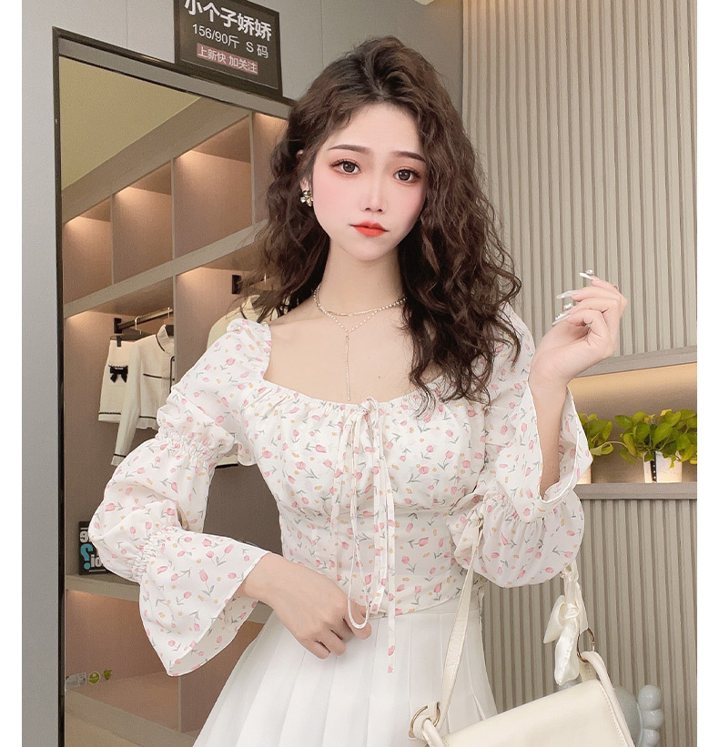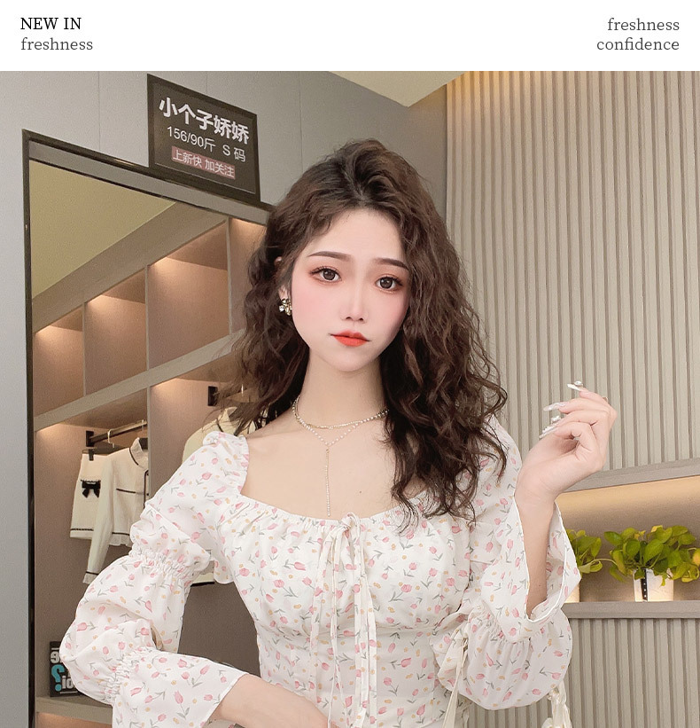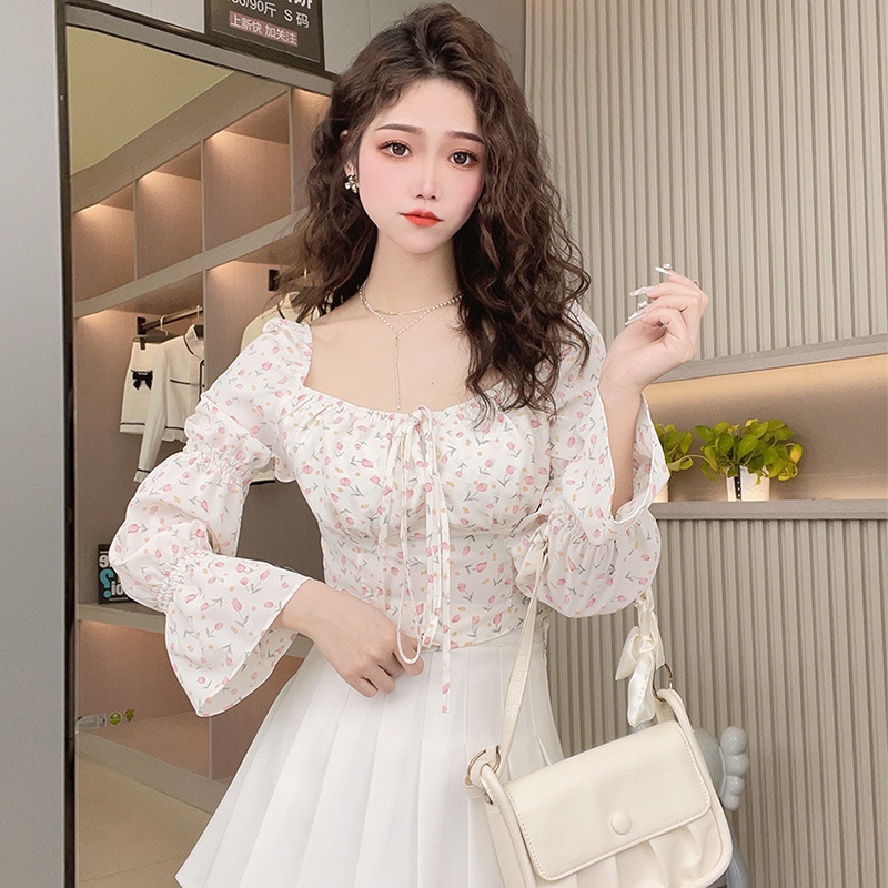 꽃 버블 슬리브 쉬폰 셔츠 여성용 디자인 달콤한 짧은 탑 목가적 스타일 레이스 업 여름 새로운 긴 소매