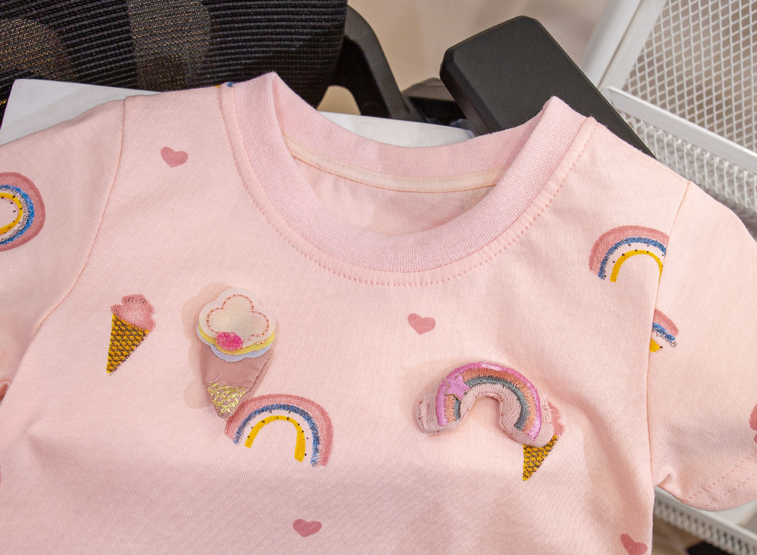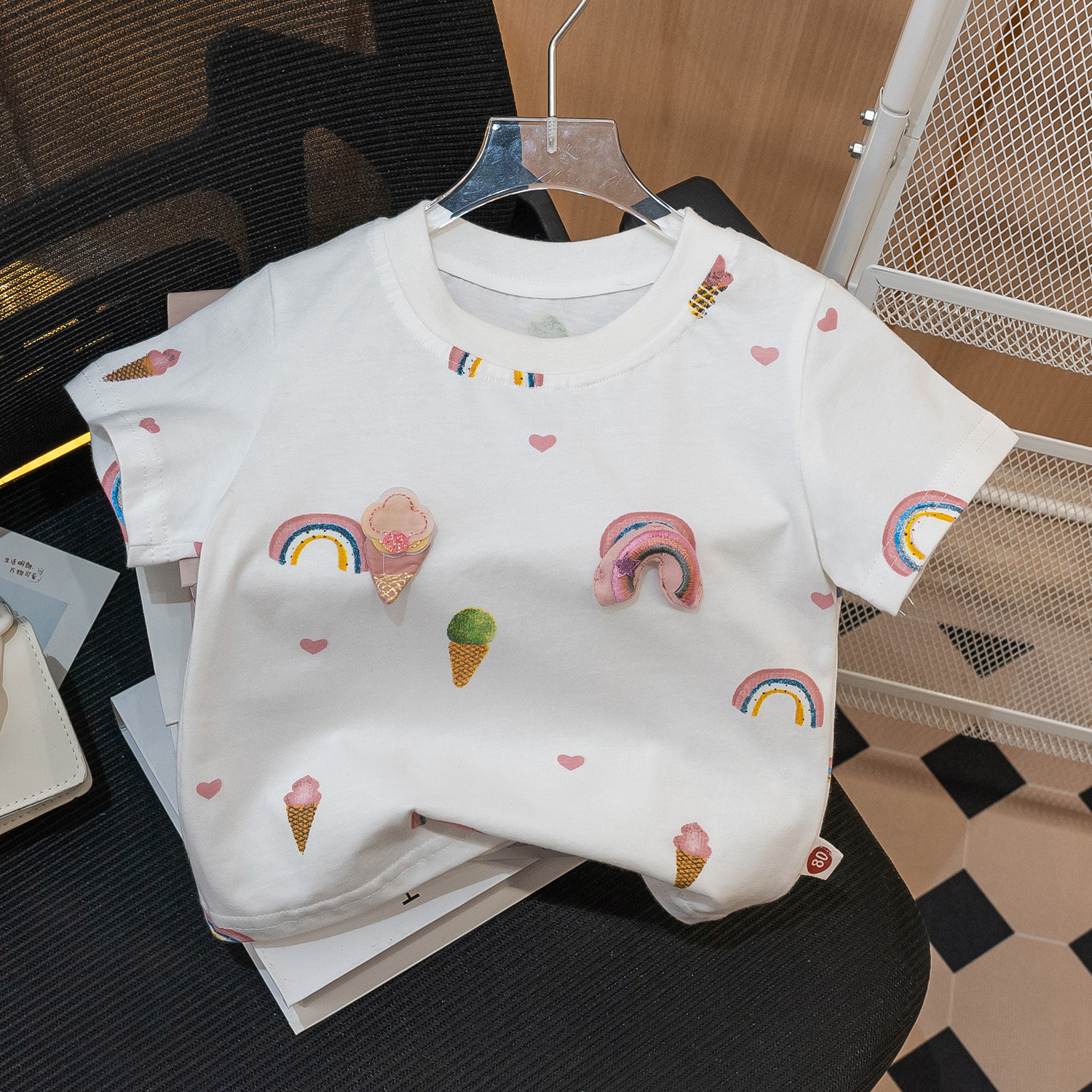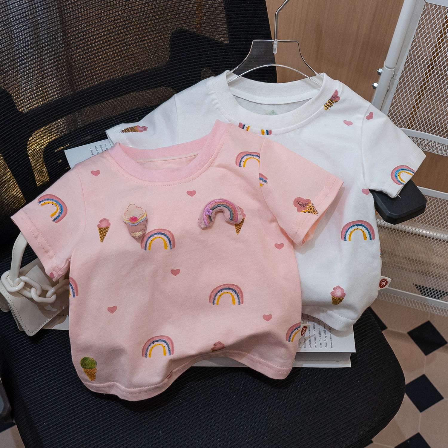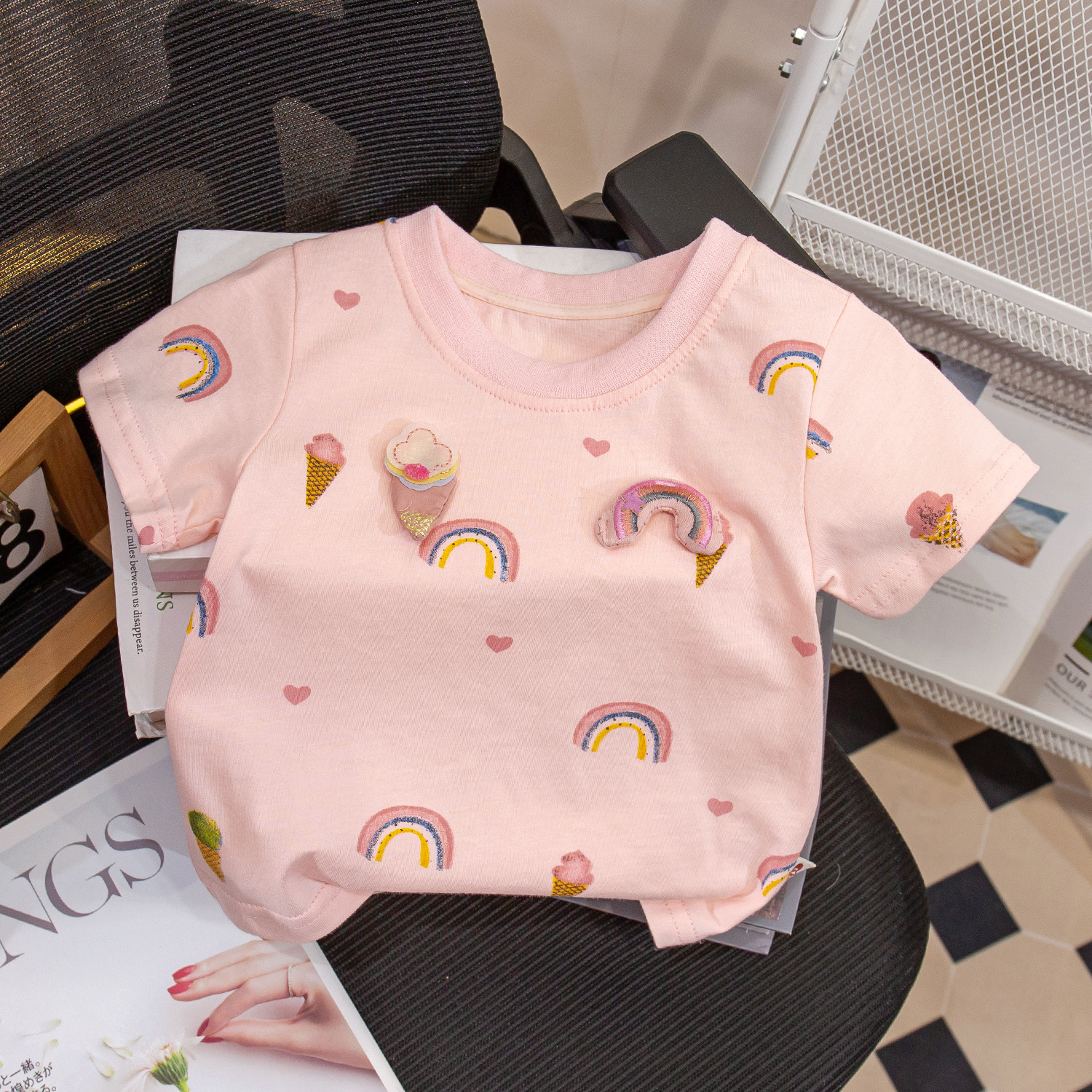 여아 여름 반팔 티셔츠 뉴 스타일 2023 면 얇은 라운드 넥 레인보우 반팔 베이비 프린트 베이스 셔츠 트렌디스토어 가기