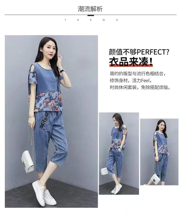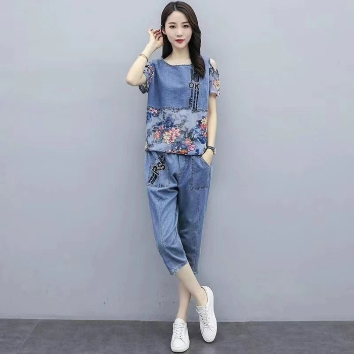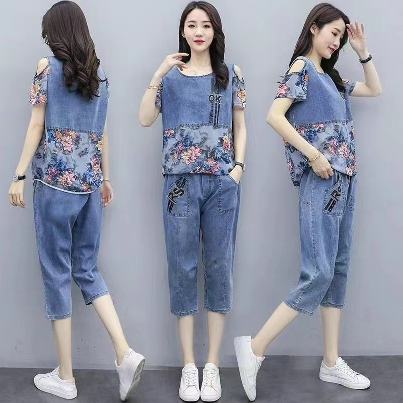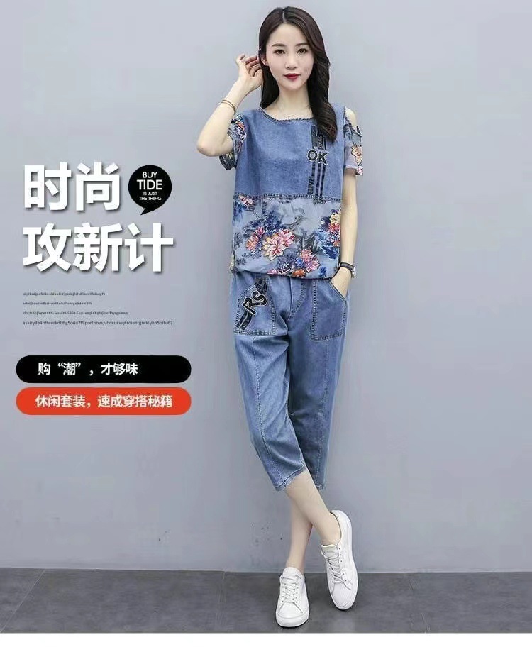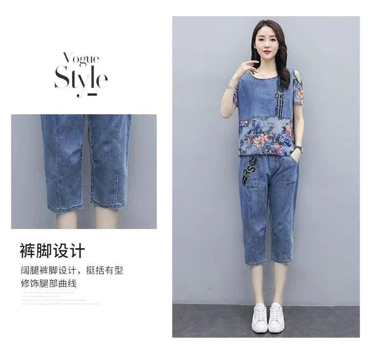 2023 여름 새로운 플러스 사이즈 여성 의류 웨스턴 스타일 패션 세트 통통한 자매 슬림 모조 데님 크롭 팬츠 투피스 세트스토어 가기
