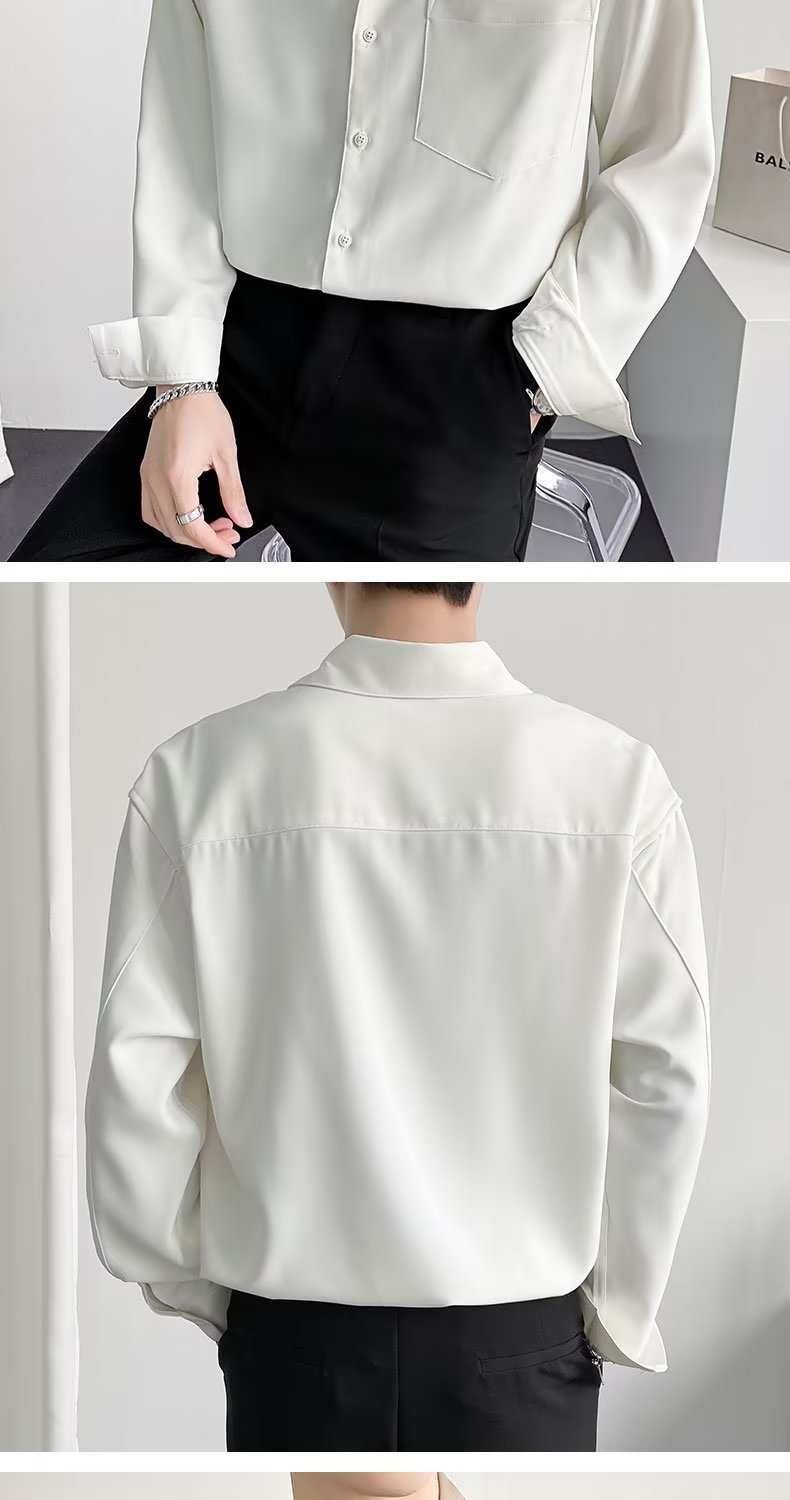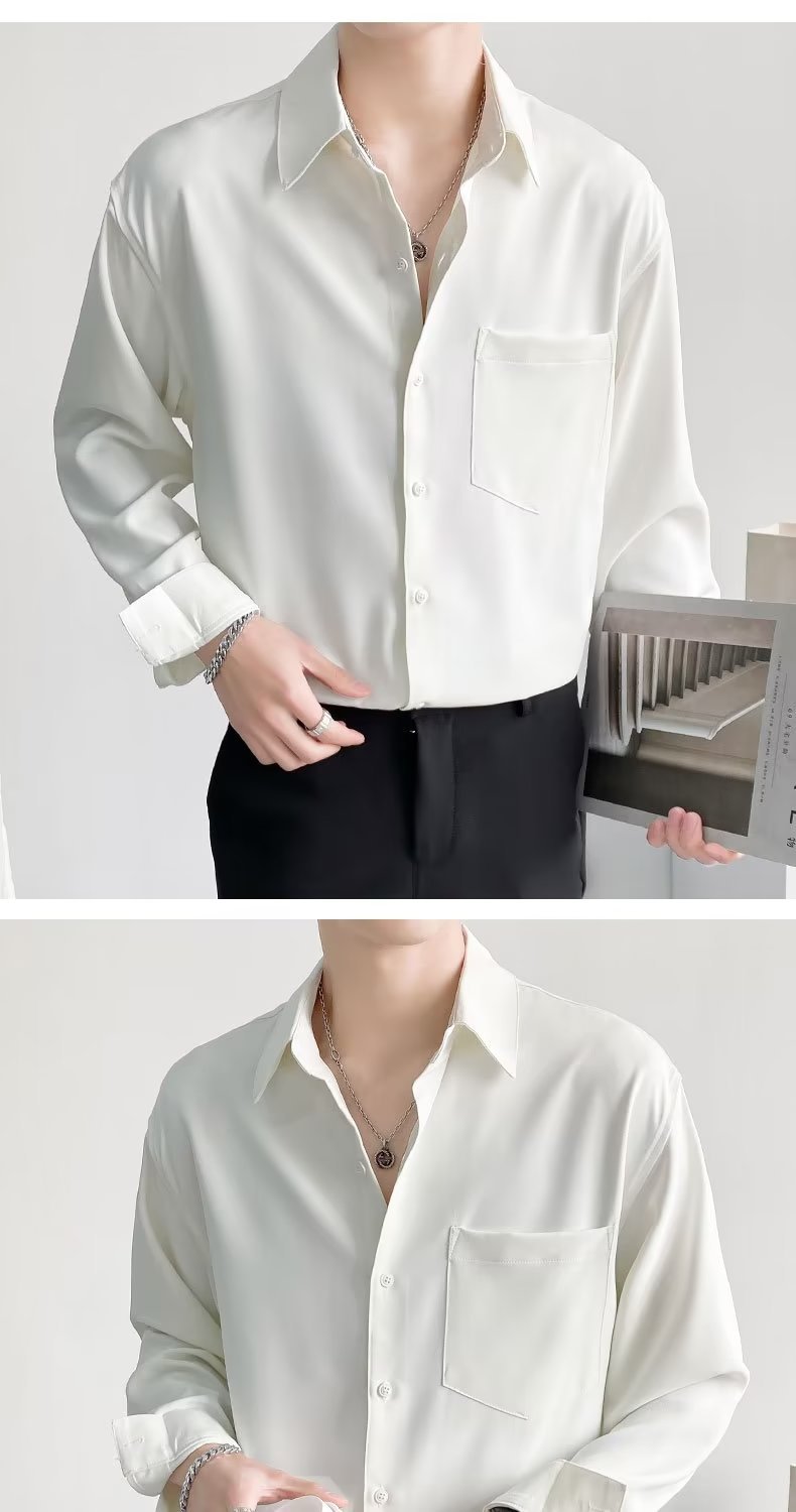 셔츠 느낌 Ruffian 화이트 봄 가을 셔츠 아이스 실크 긴 소매 얇은 가벼운 익은 착용 고급 인테리어 바람 남성 드레이프 미남