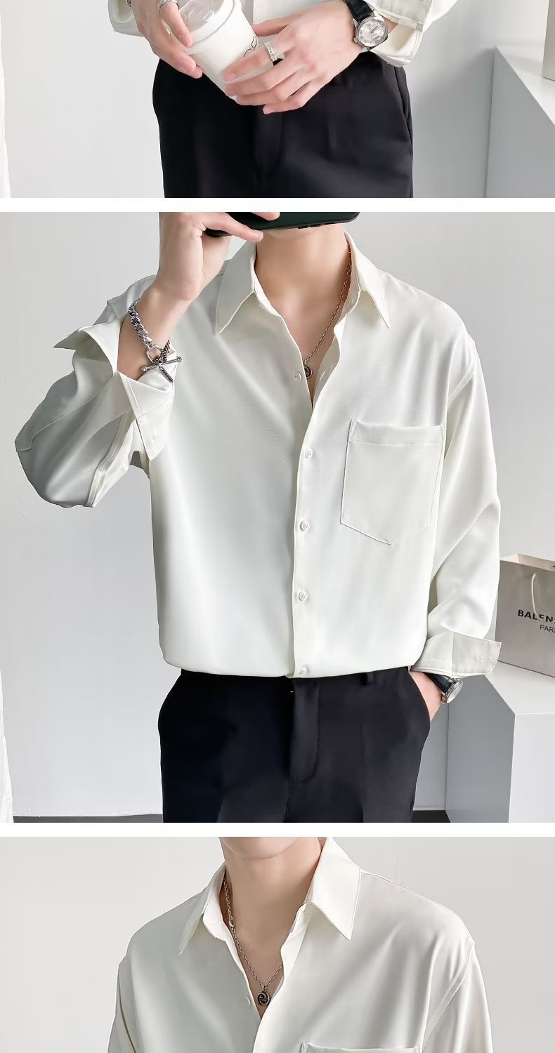 셔츠 느낌 Ruffian 화이트 봄 가을 셔츠 아이스 실크 긴 소매 얇은 가벼운 익은 착용 고급 인테리어 바람 남성 드레이프 미남스토어 가기