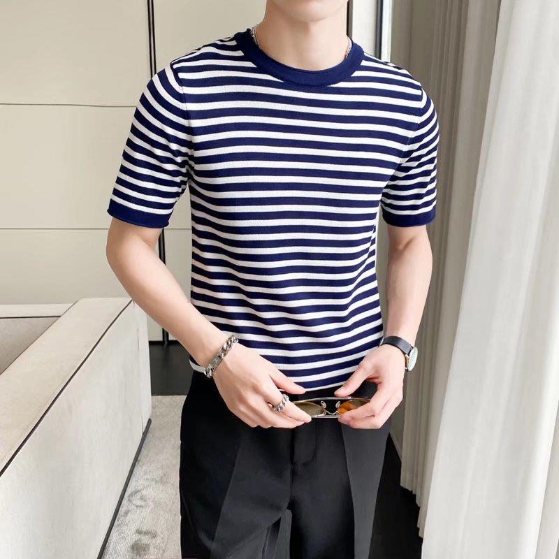 남성용 티셔츠 폭발성 얇은 2023 스트라이프 이어 속건 바닥 여름 커플 아이스 실크 니트 셔츠 반팔 라운드 넥스토어 가기
