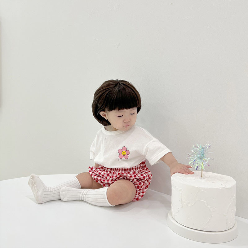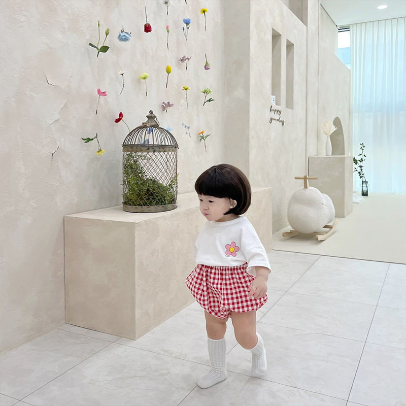 • 핑크 꽃 + 빨간 격자 무늬 바지